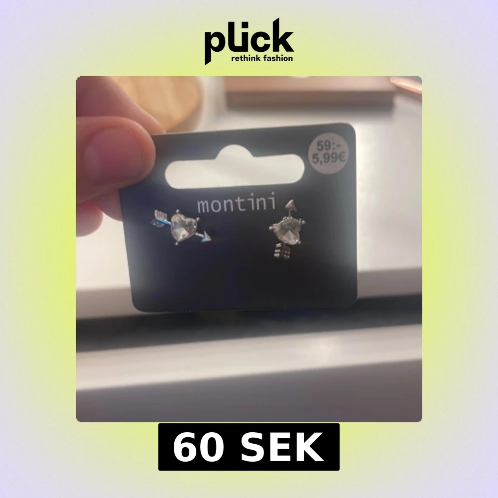 Säljer ett par silvriga örhängen från Montini med hjärtformad sten och pil-detaljer. Stenarna är klara och gnistrar snyggt, och pilen ger en cool och lekfull vibe. Perfekt för dig som gillar unika accessoarer med lite edge.