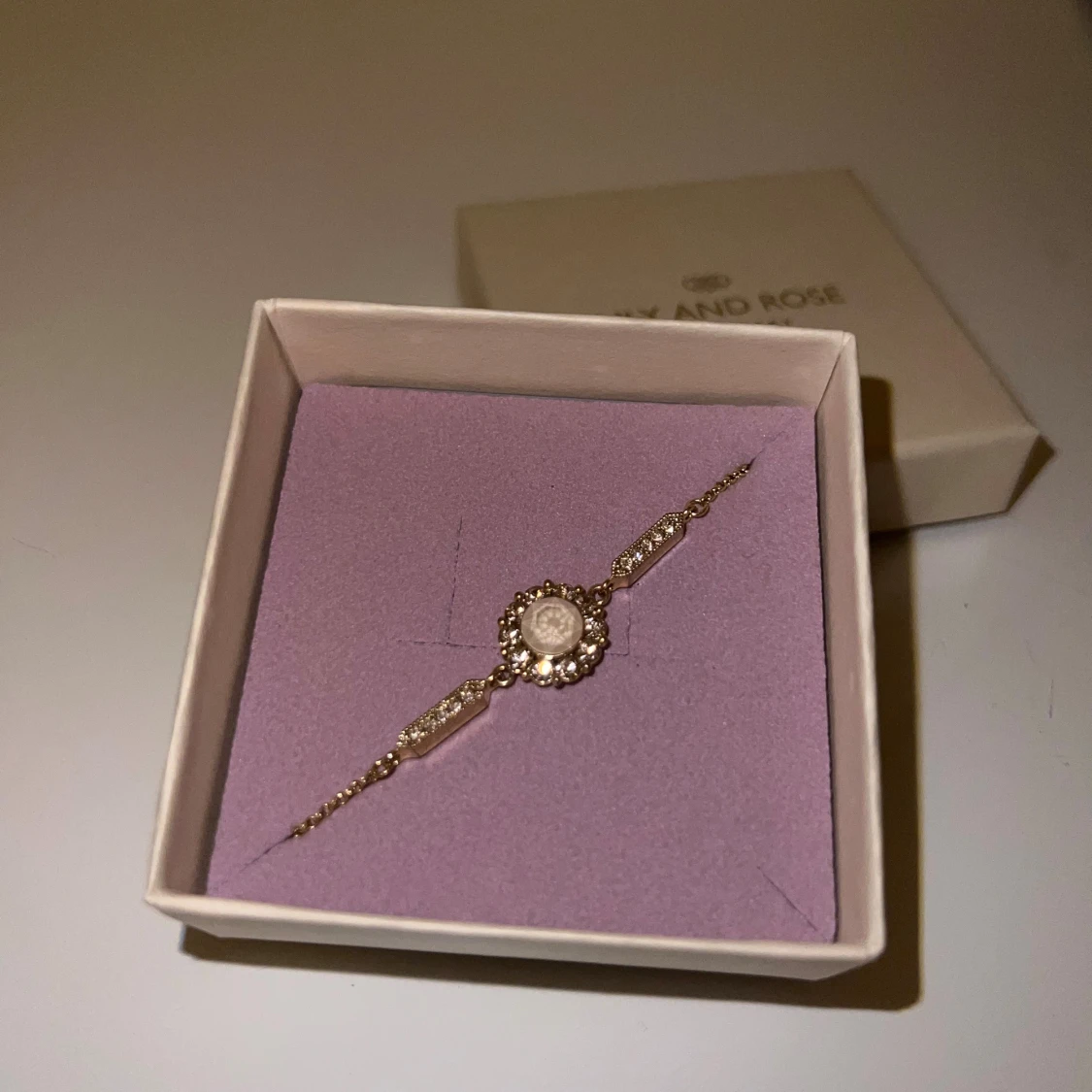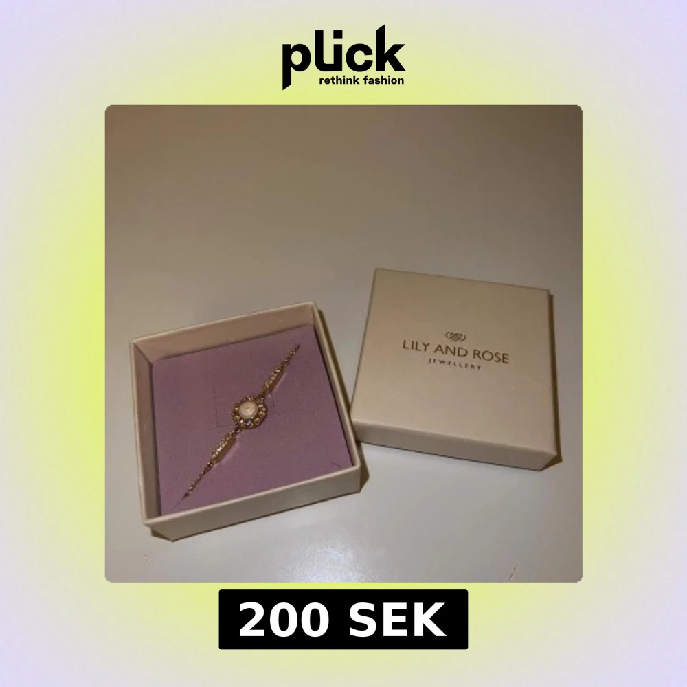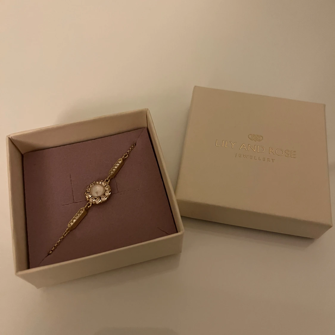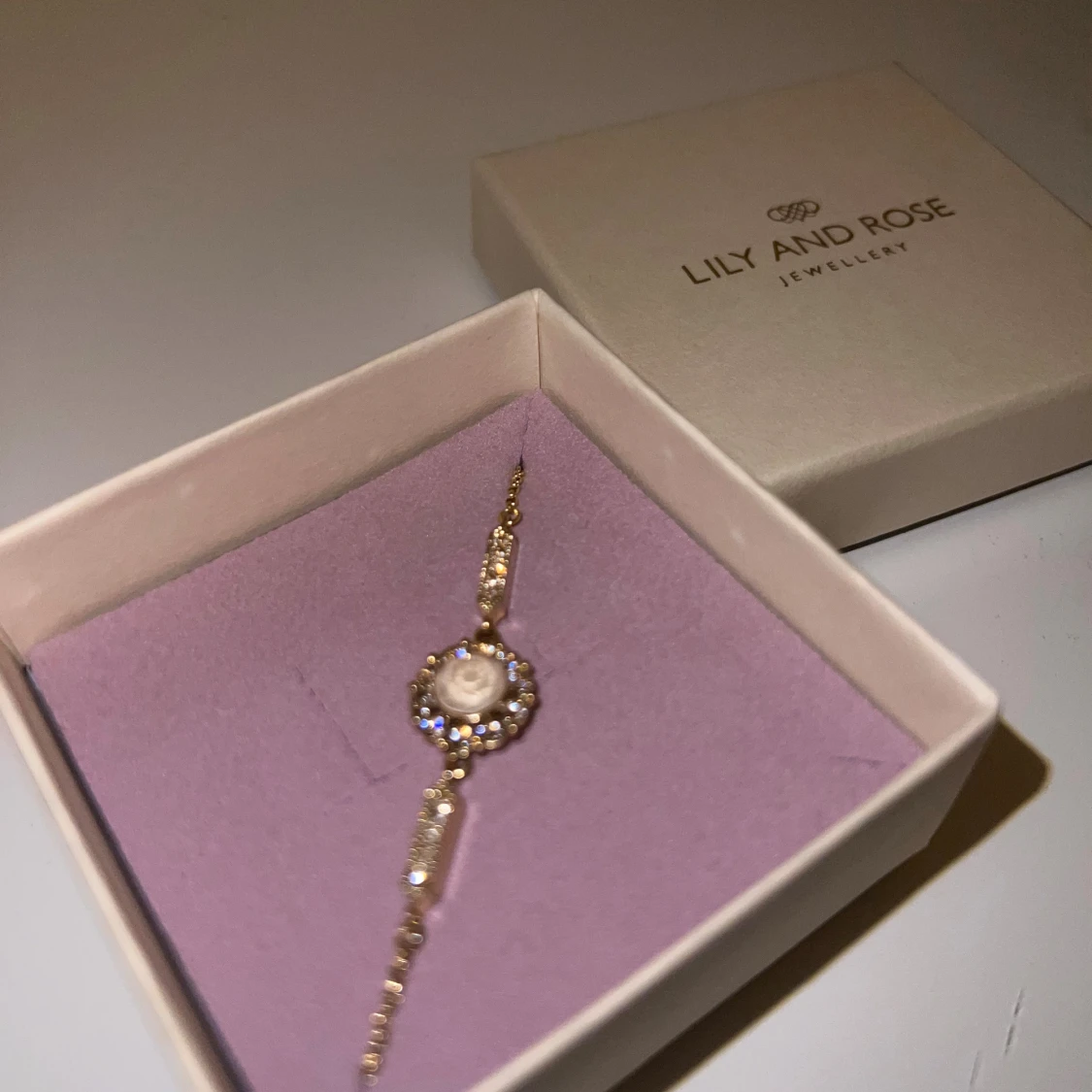 Elegant armband i guldfärg från Lily and Rose med en rund mittdel dekorerad med en pärlliknande sten och gnistrande kristaller runtom. Kedjan är tunn och smycket har fina detaljer som ger en lyxig känsla. Levereras i originalask.