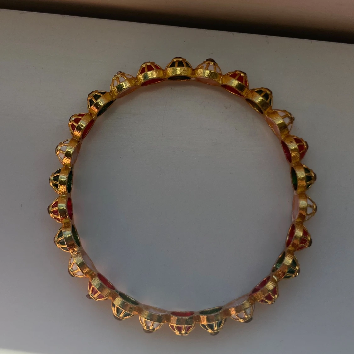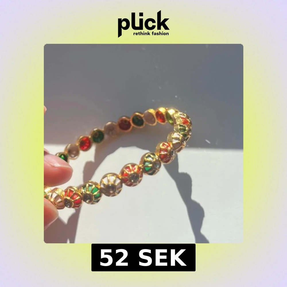 Unikt armband i guldfärgad metall med runda, blommiga detaljer i rött, grönt och vitt. Varje blomma har en liten glittrande sten i mitten som ger extra bling. Perfekt för dig som gillar färg och vill sticka ut med accessoarer.
