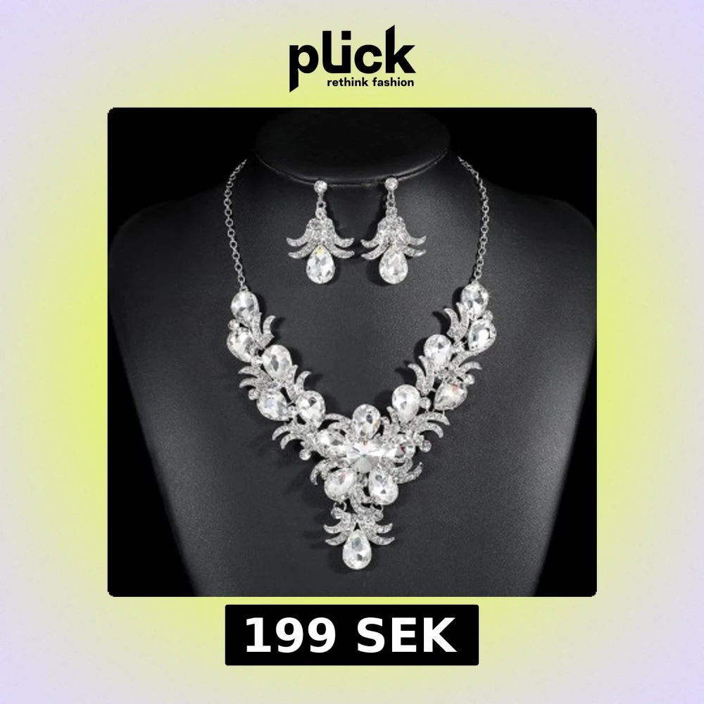 Säljer ett set med ett glittrigt halsband och matchande örhängen i silver. Halsbandet har stora, klara stenar i en elegant design och örhängena matchar perfekt med droppformade stenar. Perfekt för att lysa upp vilken outfit som helst!