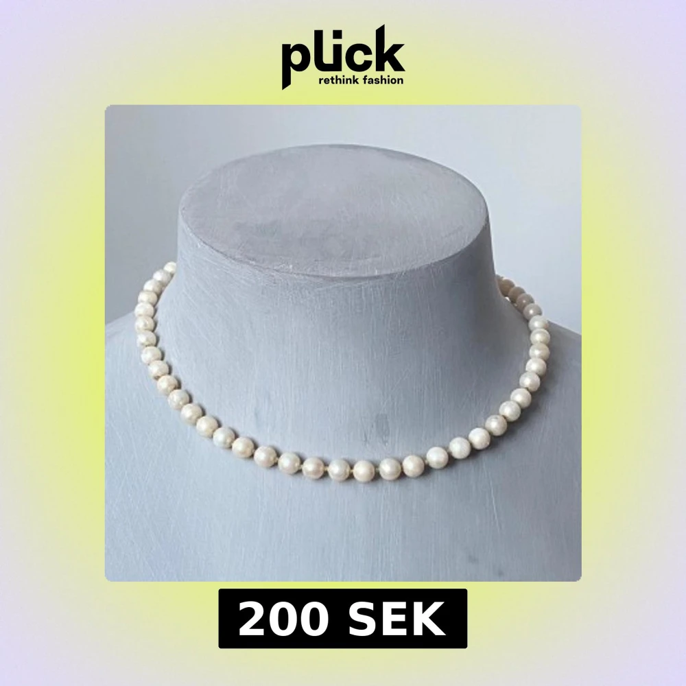 Elegant pärlhalsband med vita pärlor och ett dekorativt lås i silverfärg. Perfekt för att ge en klassisk touch till din outfit. Stämpel silver 42 cm långt med knut mellan varje pärla Skicket är okej, tecken på halsbandets ålder finns på några av pärlorna