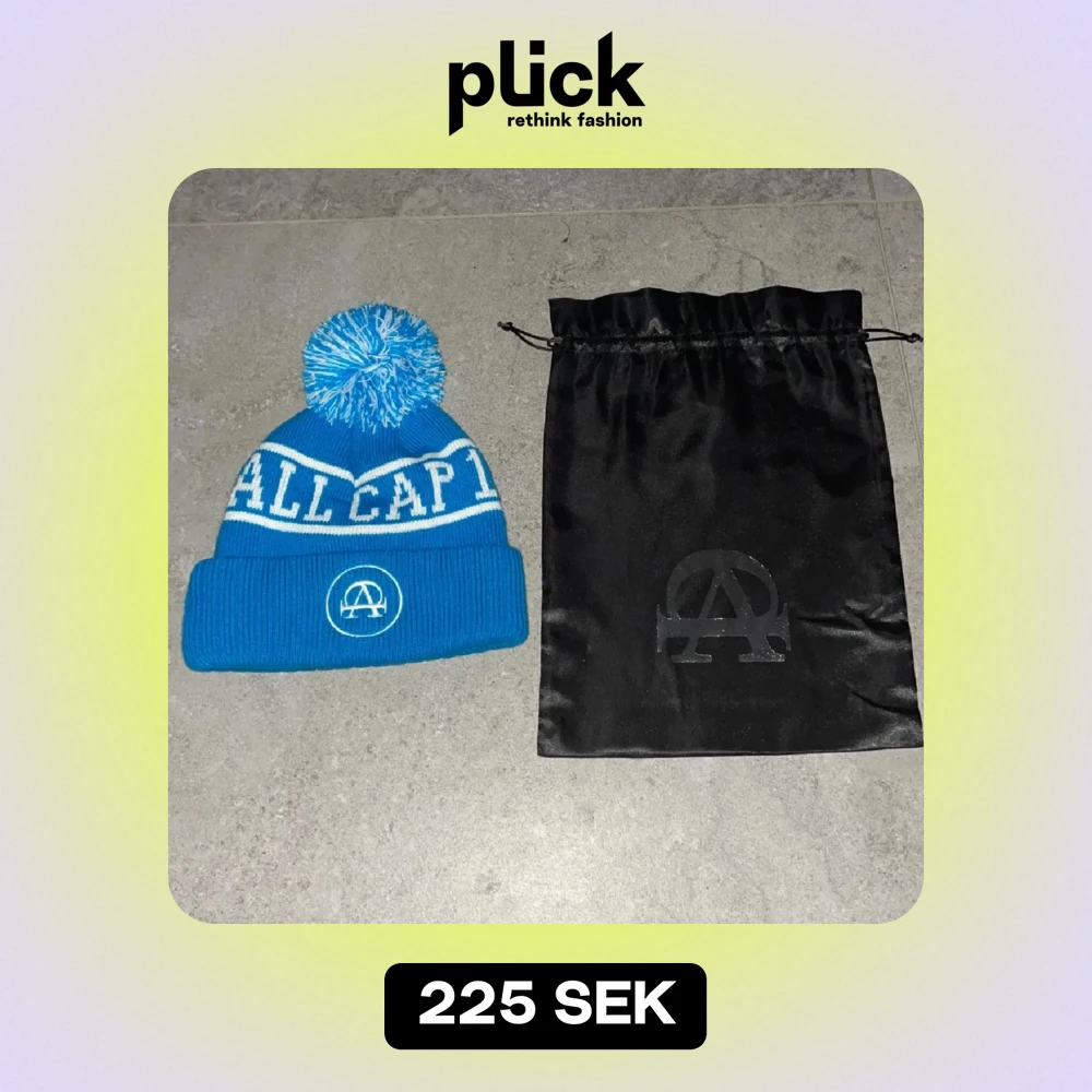 Snygg blå mössa med stor tofs och texten 'ALL CAP' i vitt. Mössan har en ribbad kant och ett tryckt emblem framtill. Perfekt för kalla dagar! Pris kan diskuteras Ny pris 300kr påse får man med