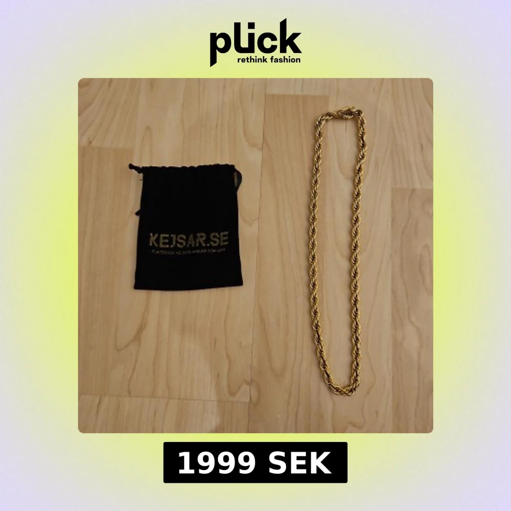 Snyggt halsband från Kejsar.se med repdesign, pläterat i 18K guld. 2500 SEK ordinarie pris. Kedjan har en robust låsdel med 18K-markering och kommer med en svart tygpåse med Kejsar.se-logga. Perfekt för dig som gillar statement-smycken med lyxig känsla.