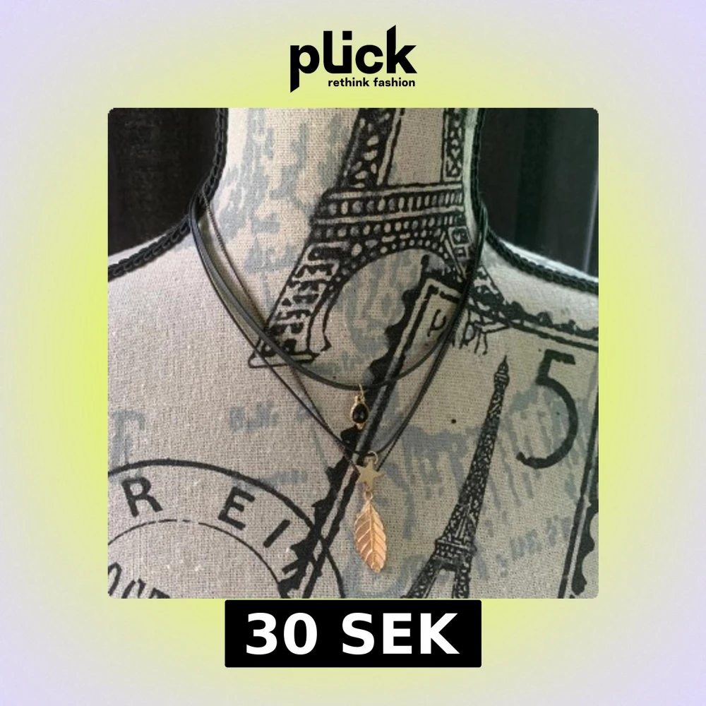 Dubbel svart choker med tunna band, prydd med en guldig stjärna, ett löv och en liten svart sten. Snyggt lager-på-lager-utseende som ger en cool och trendig vibe. Perfekt accessoar för att lyfta din outfit. Pris går såklart att diskutera