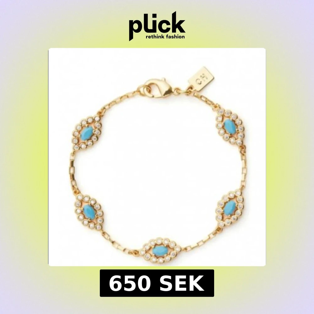 Superfint guldarmband med fem ovala länkar, varje länk har en turkos sten i mitten omgiven av små gnistrande stenar. Kedjan är tunn och elegant med en diskret Crystal Haze- tag vid låset. Perfekt för att ge din look lite extra färg och bling.