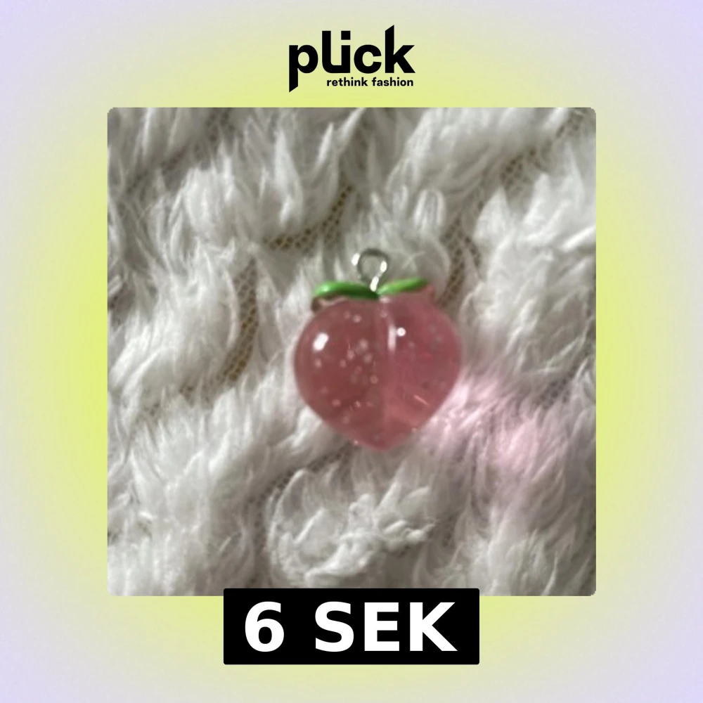 Supergullig berlock i form av en persika, perfekt till halsband. Den är rosa med glittriga detaljer och har ett grönt blad upptill. Berlocken är gjord i plast och har en söt, rundad form som verkligen poppar.