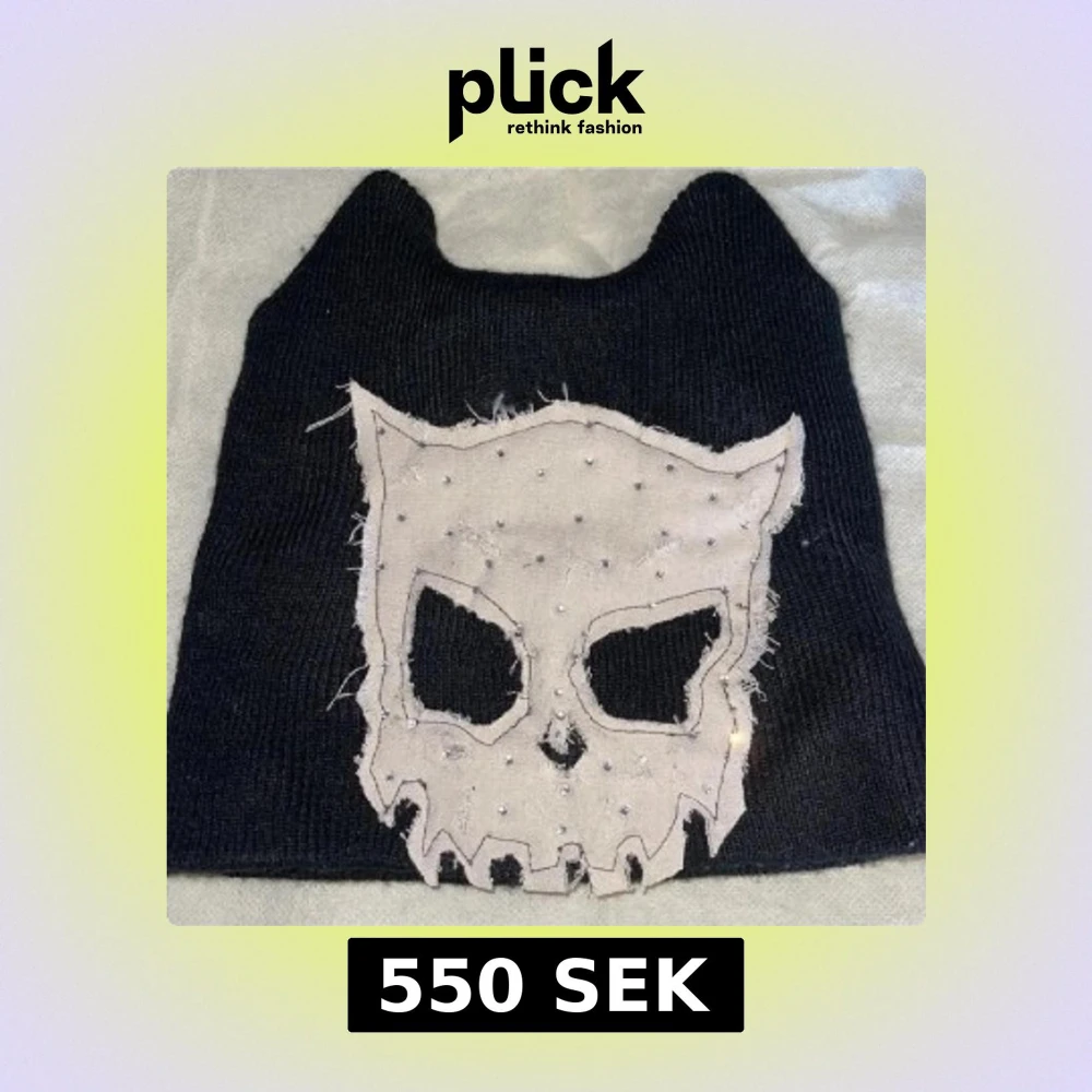 Cool svart stickad mössa med spetsiga hörn och ett stort vitt döskallemotiv framtill. Döskallen är dekorerad med små pärlor och har en rå, fransig kant för extra edge. Perfekt för dig som gillar unik streetstyle.
