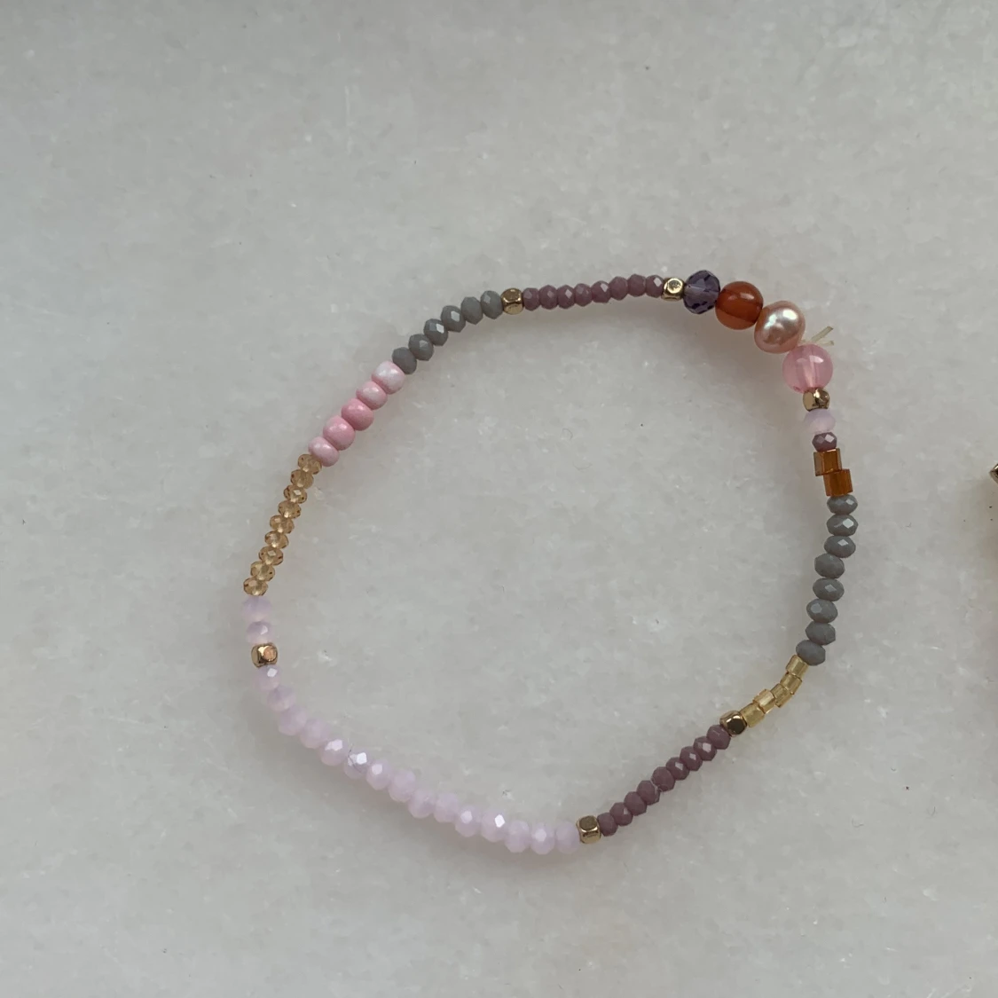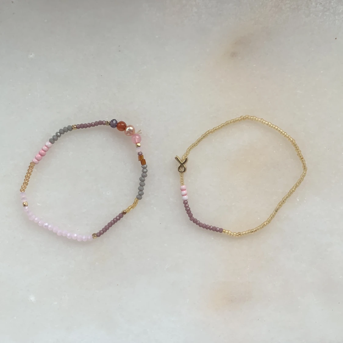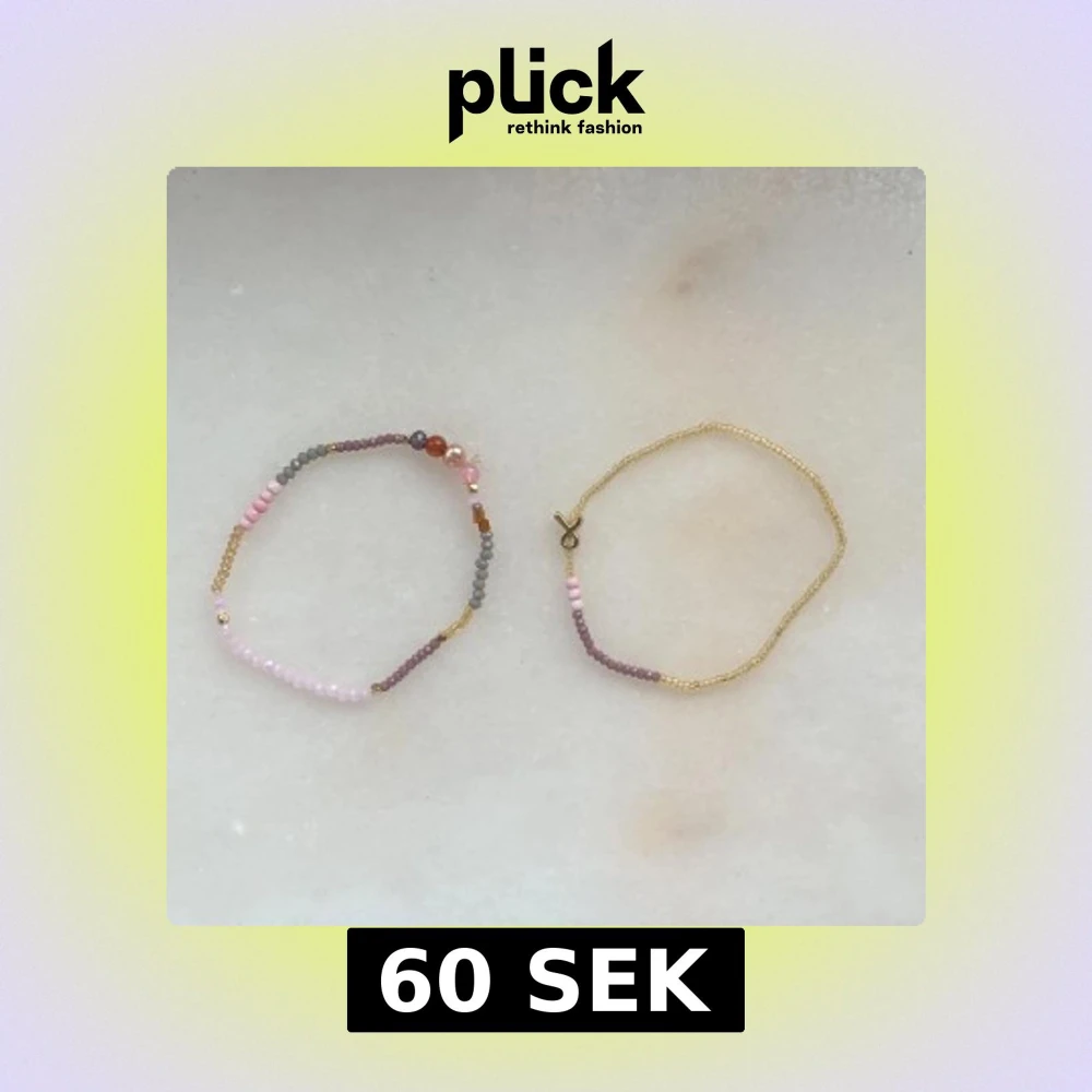 Säljer två handgjorda armband med små pärlor i guld, rosa, lila, grått och rött. Ena armbandet har mixade pärlor och små detaljer i olika färger, det andra har en enkel design med guld och lila pärlor samt ett litet lås. Perfekt för dig som gillar unika accessoarer.