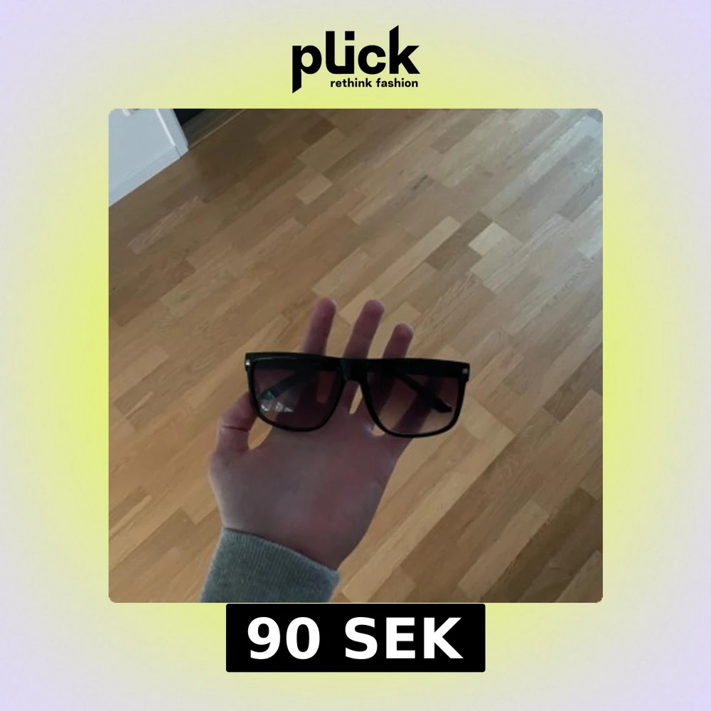 Säljer ett par stilrena svarta solglasögon med breda bågar och fyrkantig form. Glasen är mörka med en lätt toning som går från svart till brunt. Perfekta för att ge en cool vibe till din outfit.