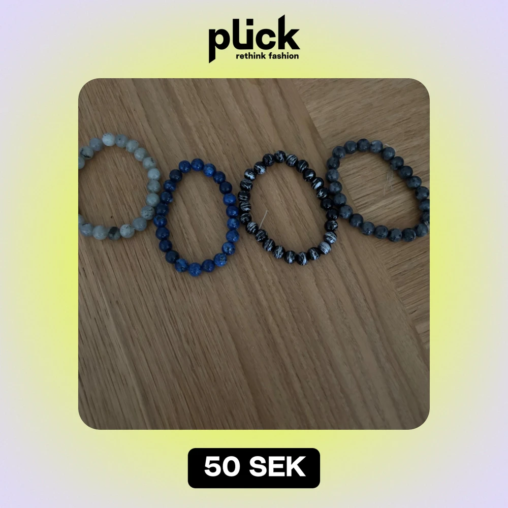 Säljer fyra snygga armband med pärlor i olika färger. Ett armband har ljusgrå pärlor, ett har djupblå pärlor, ett har svarta och vita mönstrade pärlor, och det sista har mörkgrå pärlor. Perfekta för att matcha med olika outfits och tillfällen! De kostar 50krst
