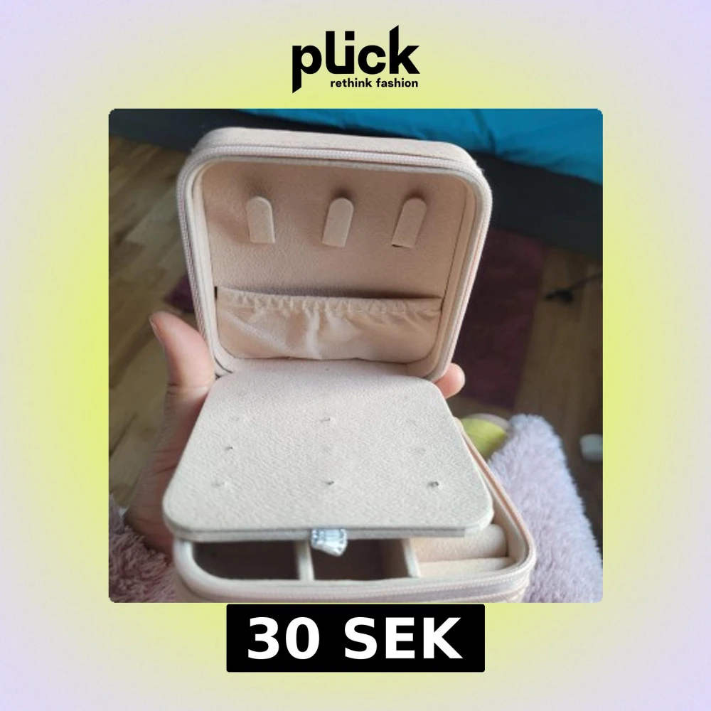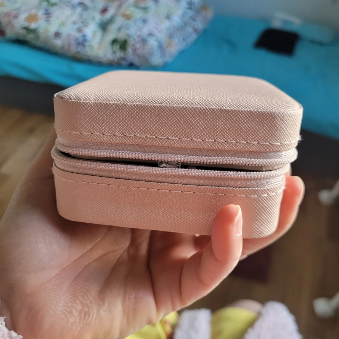 Praktiskt och stilrent rosa smyckeskrin med dragkedja. Insidan har flera fack och hållare för att organisera smycken som ringar, örhängen och halsband. Perfekt för resor eller förvaring hemma.