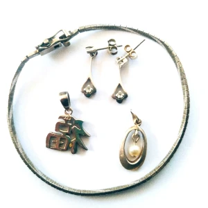 Allt i äkta silver, fint skick!. Armbandet är 6 cm i diameter och märkt med S och kattfoten, hänget med äkta sötvattens pärla i är 2,7 cm långt och 8 mm brett märkt med 925, kinesiskt hänge 925, 2,4 cm långt och 2,1 cm brett, örhängen märkta med 925,