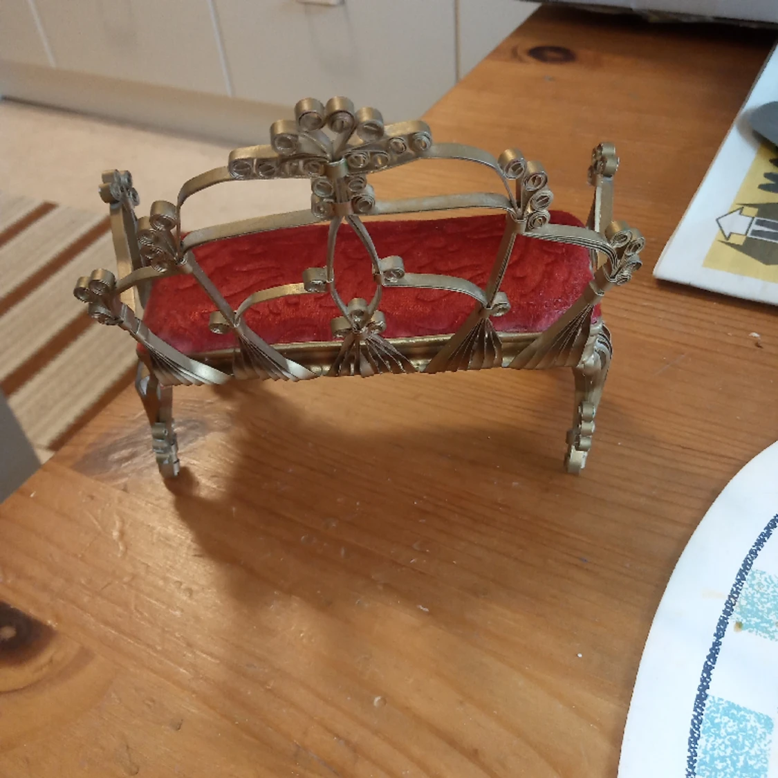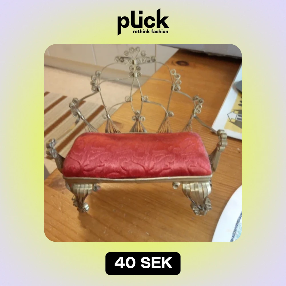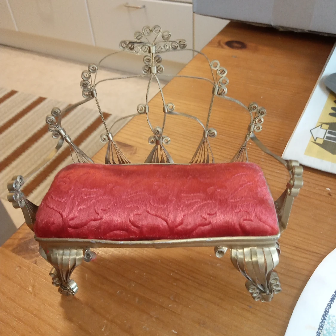 Soffa med nålsdyna 14 cm lång och gjord av ölburk .