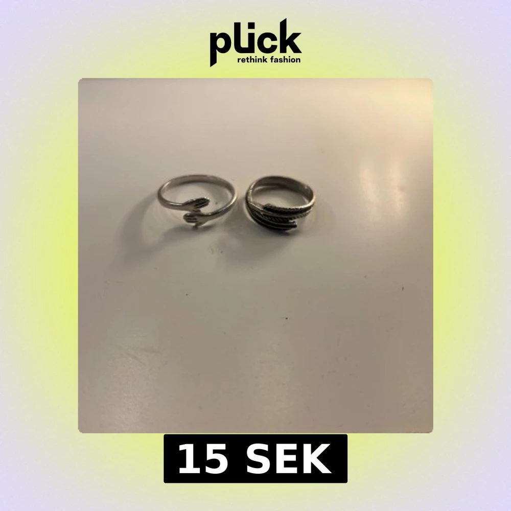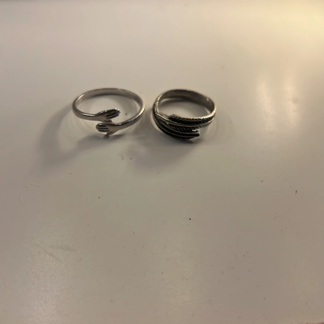 Säljer två silvriga ringar, en med handformad detalj och en med fjädermönster. Båda är öppna i modellen och har en unik, trendig look som passar perfekt för dig som gillar att sticka ut med dina accessoarer.