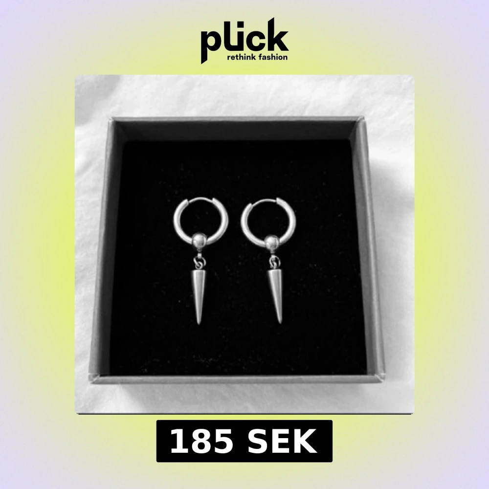 Säljer ett par coola silvriga örhängen med rund ring och hängande konformad detalj. Perfekta för dig som gillar edgy och minimalistisk stil. Kommer i en snygg ask och passar till många olika outfits.