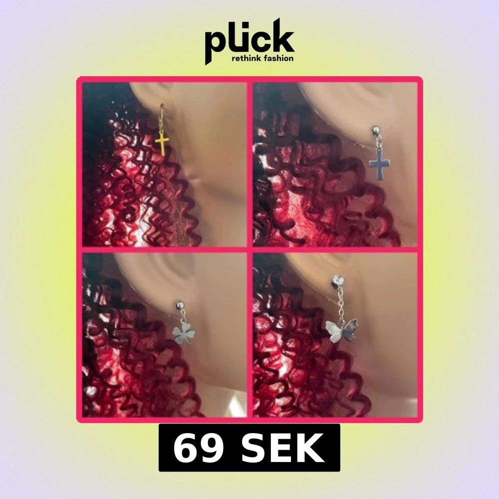 Säljer1 st man kan välja mellan fyra olika par örhängen med hängande motiv: kors i guld och silver, fyrklöver i silver samt fjäril i silver med liten glittrig sten. Perfekt för dig som vill variera din stil med snygga detaljer.