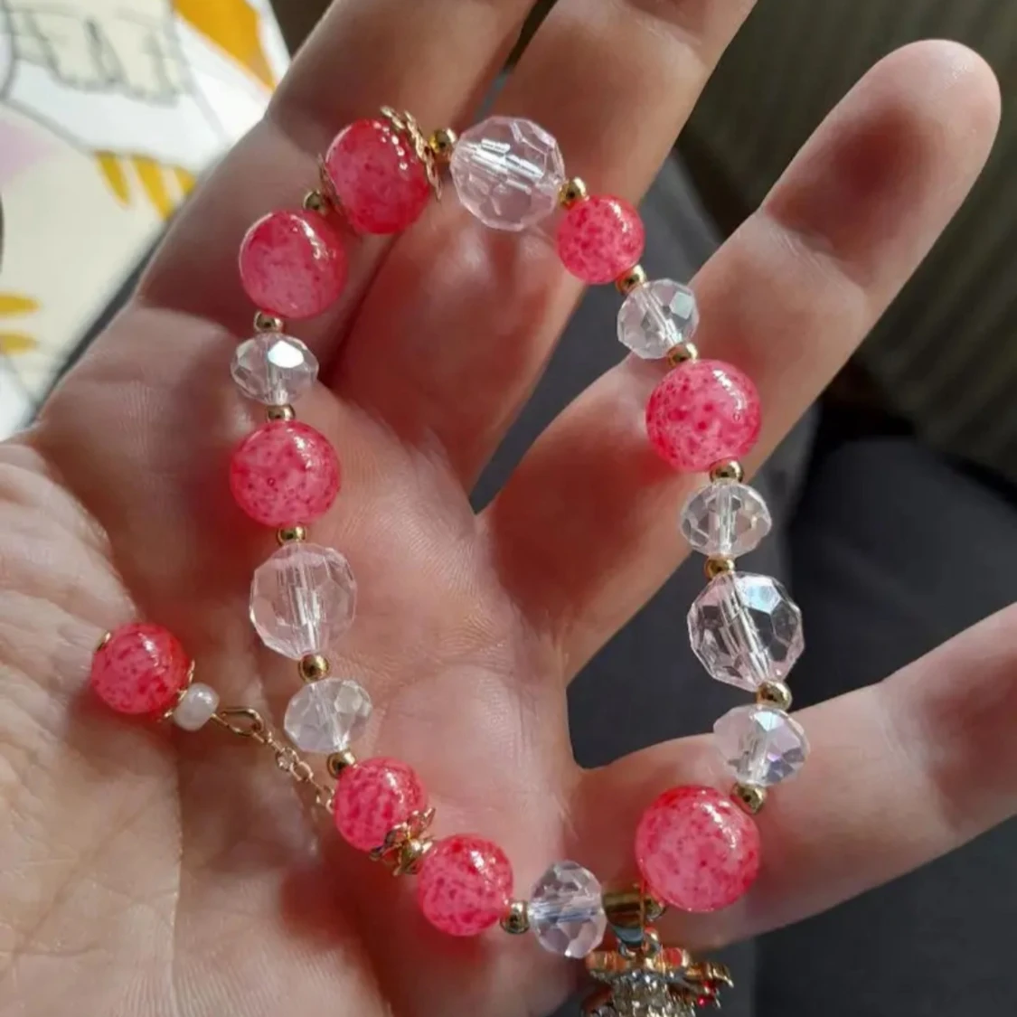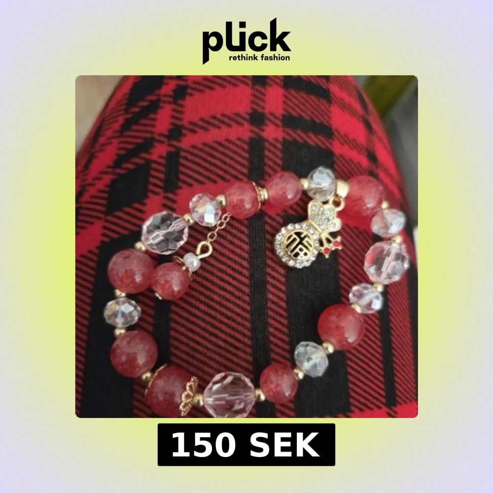 Unikt armband med röda och klara facetterade pärlor, guldfärgade detaljer och ett hängsmycke med gnistrande stenar och asiatiskt tecken. Armbandet har även en liten kedja med extra pärla för en cool touch.