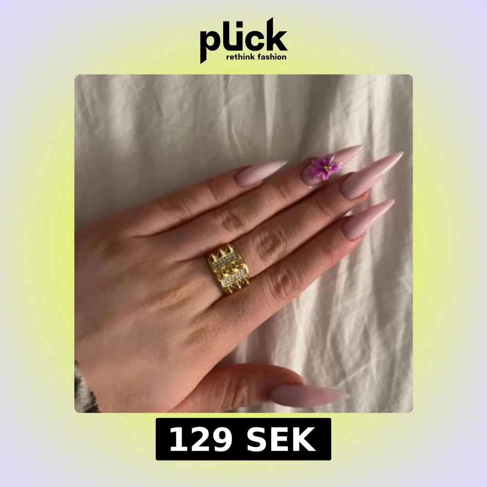 Säljer en bred guldfärgad ring med tre rader av gnistrande stenar. Ringen har en modern och chunky design som sticker ut och passar perfekt som statement-smycke. Levereras i en röd presentask med rosett.