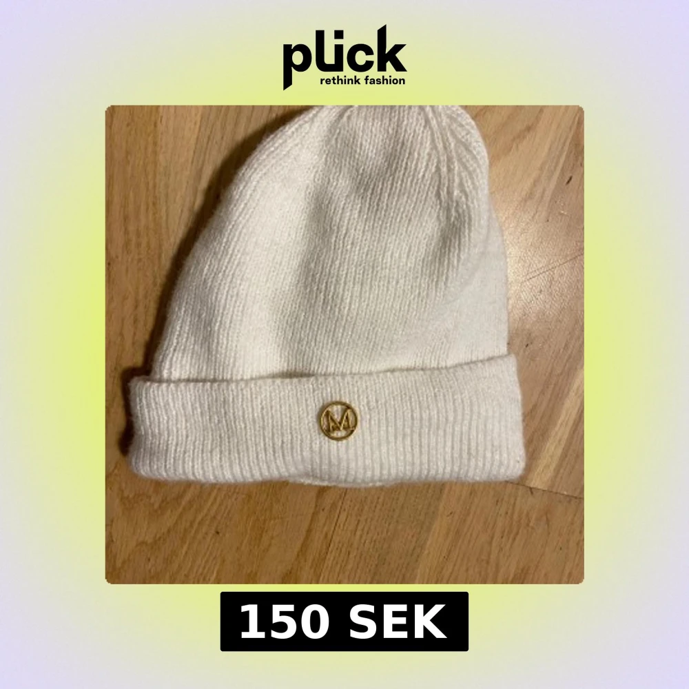 Snygg vit stickad mössa med uppvikt kant och en liten guldfärgad M-logga framtill. Perfekt för kalla dagar och enkel att matcha med din vinterstil. Mjuk och skön passform som håller dig varm och ser clean ut.