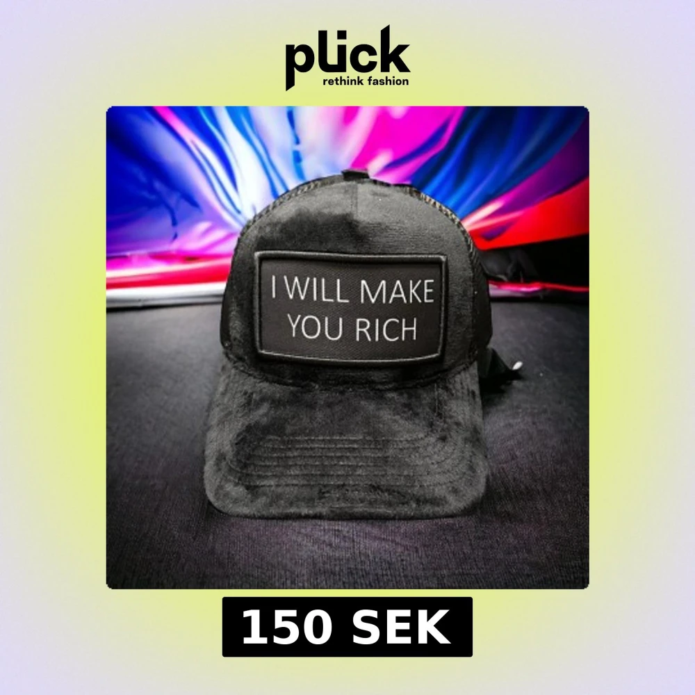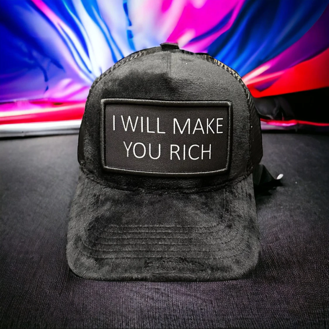 Svart keps med mjuk, pälsliknande yta och mesh på sidorna. Framtill sitter en stor patch med vit text: 'I WILL MAKE YOU RICH'. Justerbar baktill för perfekt passform. Perfekt statement-piece för dig som vill sticka ut.