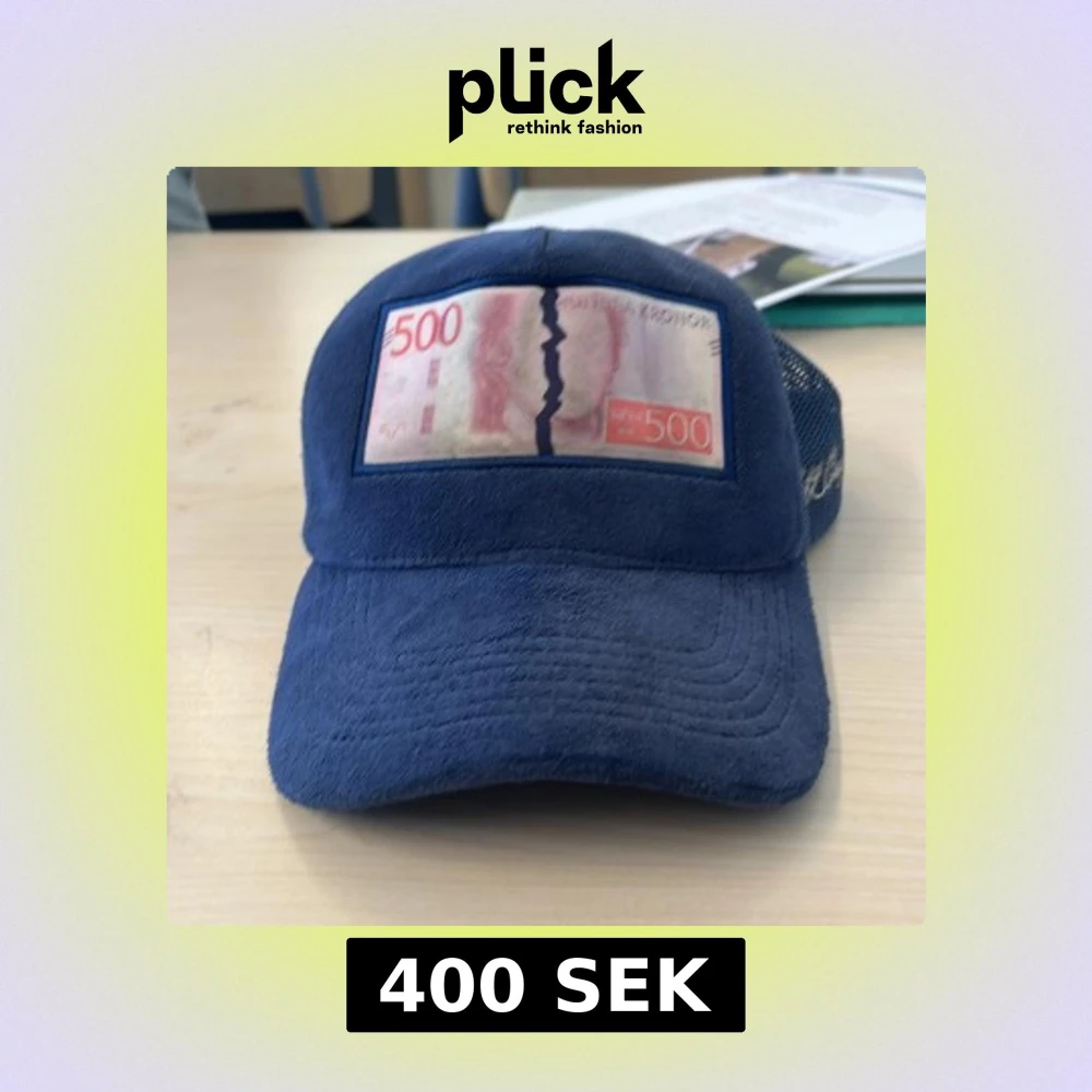 Snygg blå keps med ett unikt sedelmotiv på framsidan. Kepsen har ett nätmaterial på baksidan för extra ventilation och justerbar rem för perfekt passform. Perfekt för en avslappnad stil.