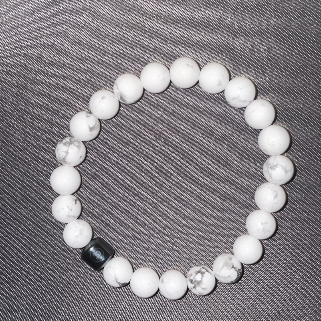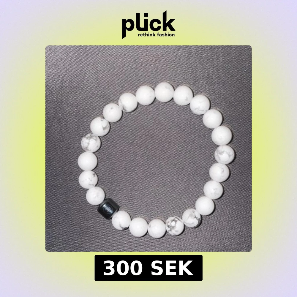Stilrent armband med runda vita pärlor och diskret grått marmormönster. En svart fyrkantig pärla ger en cool kontrast. Perfekt accessoar för att lyfta din outfit med en minimalistisk touch.