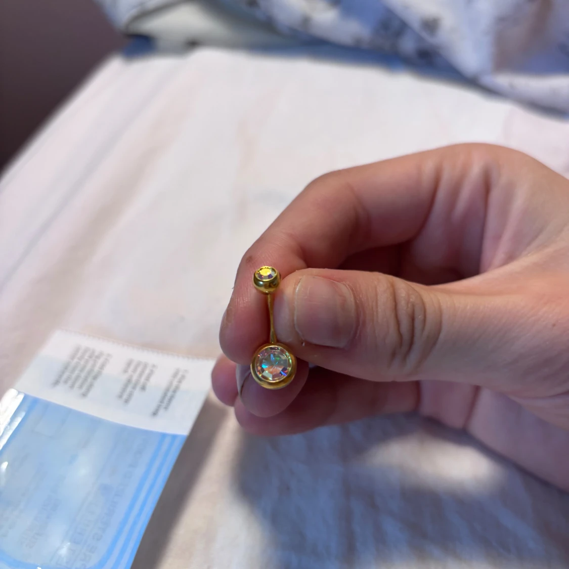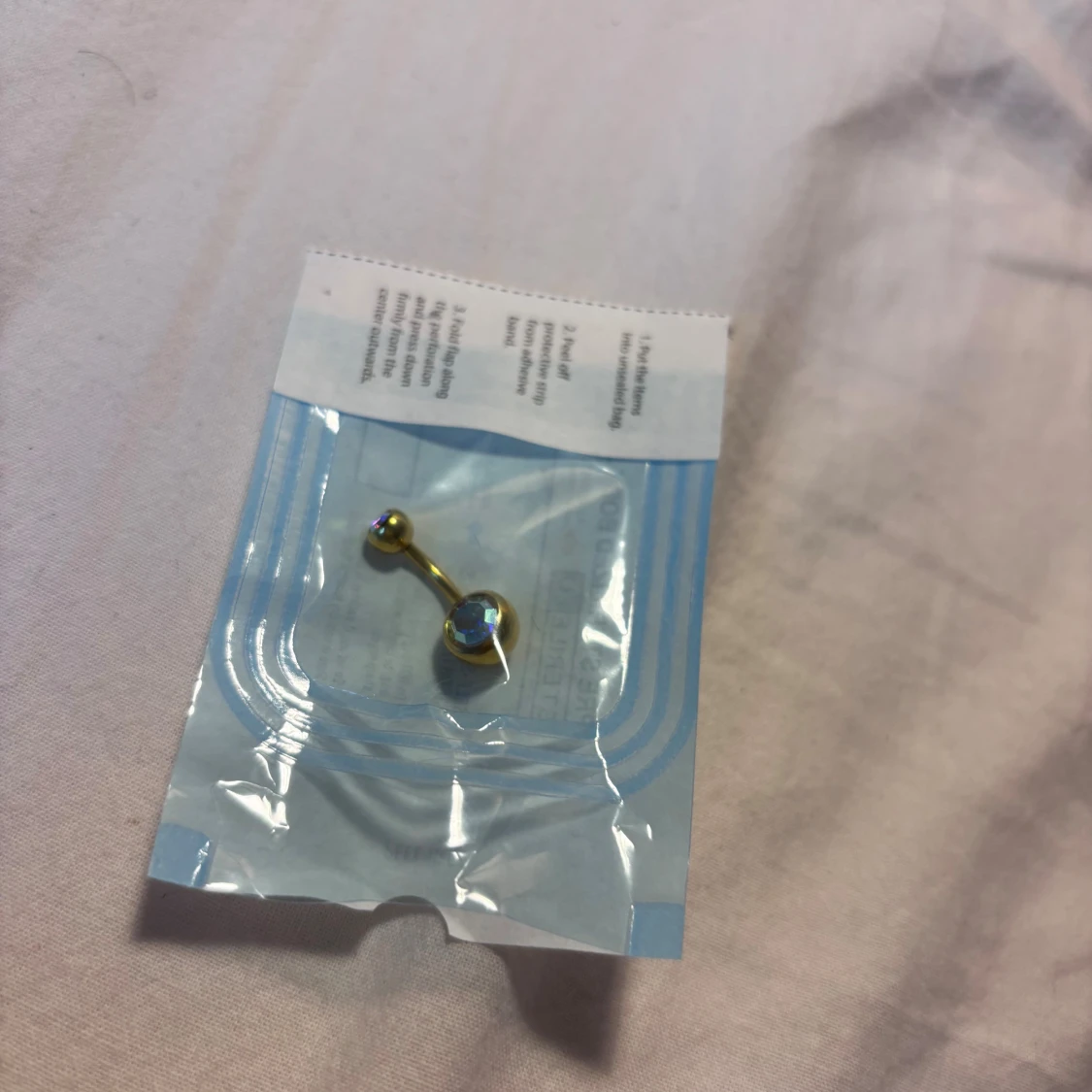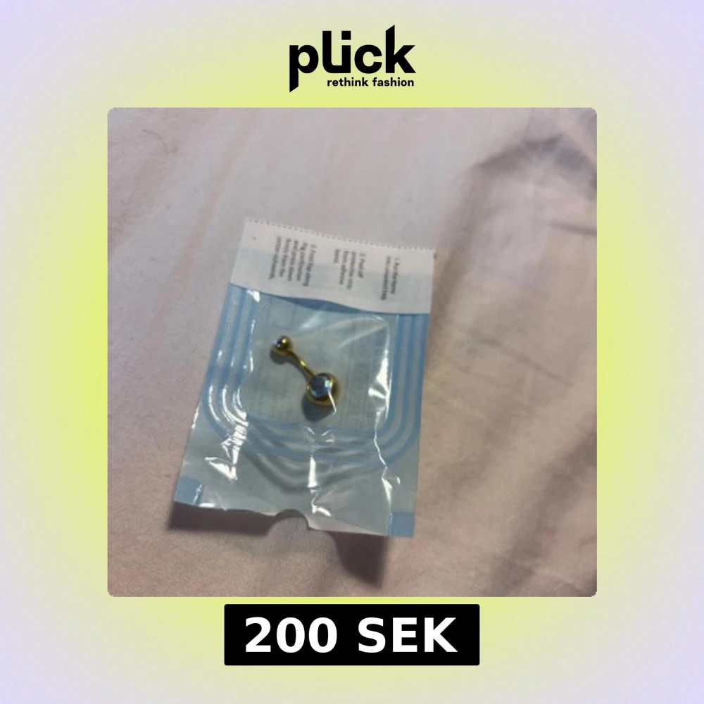 Helt oanvänd snygg navelpiercing från India Bodypiercing & Jewellery i kirurgiskt stål med guldtonad finish. Tappar inte färg! Hade råkat beställa 2 st därför jag säljer vidare och har använd den andra vilket är superbra kvalité. Piercingen har två klara, glittriga stenar som fångar ljuset och ger extra bling. Perfekt för dig som vill ha något som sticker ut och känns lyxigt. 10 mm