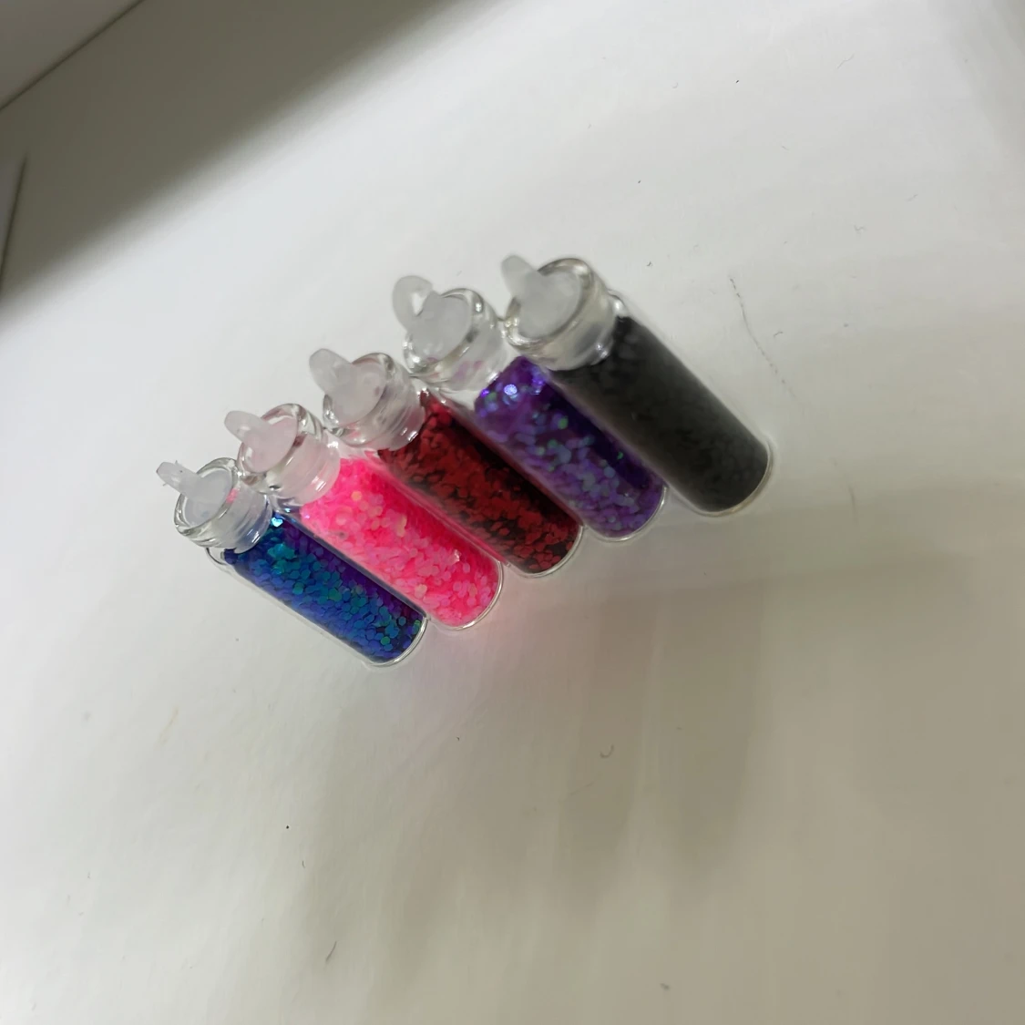 Säljer ett set med fem små flaskor fyllda med färgglatt glitter. Färgerna inkluderar blå, rosa, röd, lila och svart. Perfekt för att lägga till lite extra bling eller för kreativa projekt. Varje flaska har en praktisk kork för enkel förvaring. Helt oanvända och helt oöppnat!!!! Alla 5 kostar tillsammans 66kr annars kostar en 15kr