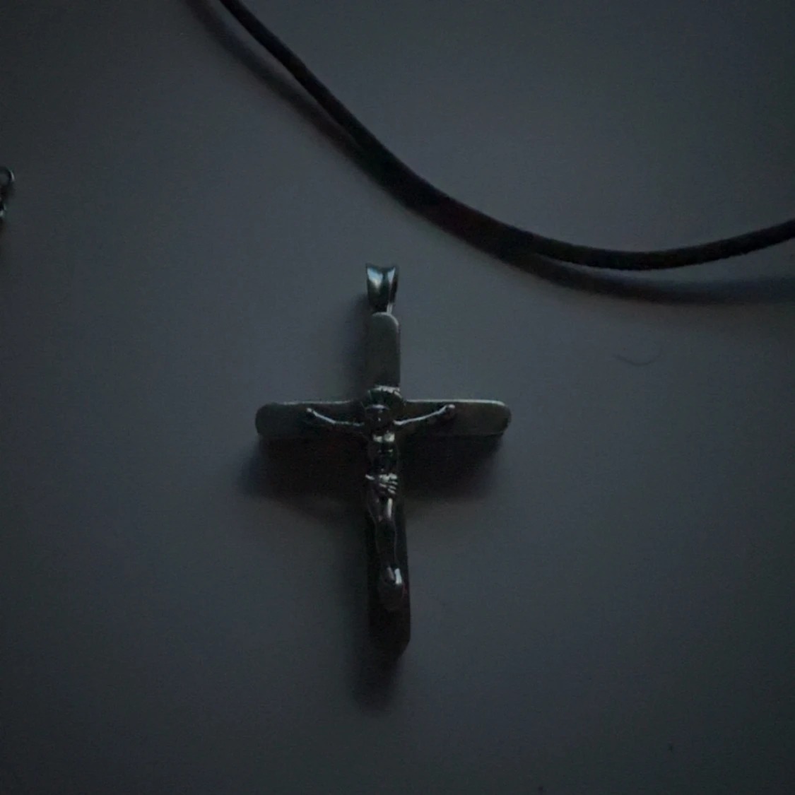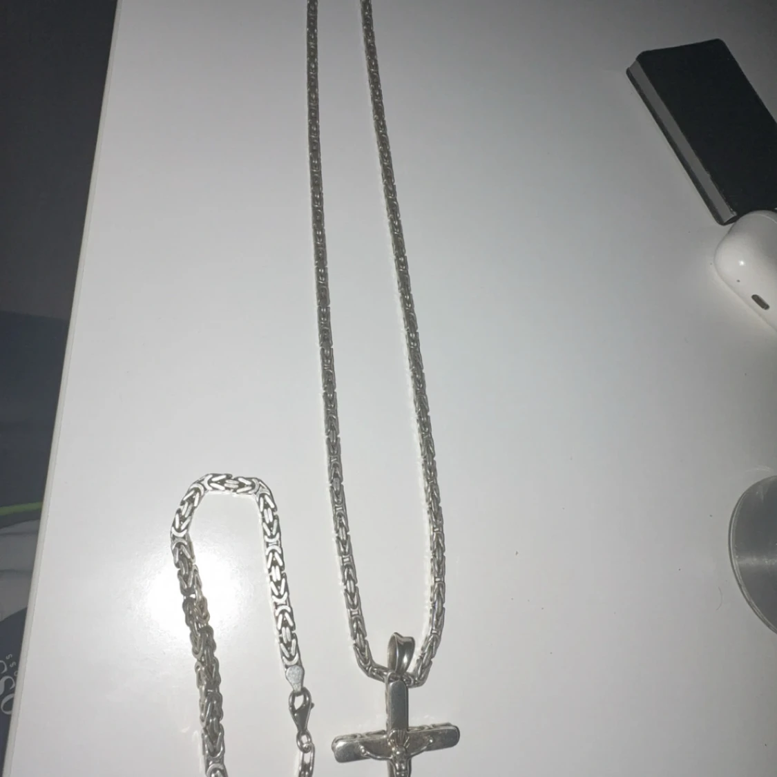 Säljer ett snyggt halsband i äkta 925 silver med ett korshänge med Jesusmotiv, samt ett matchande armband. Båda har coola kedjor med flätad design. Perfekt för dig som vill ha en stilren och klassisk look med edge.