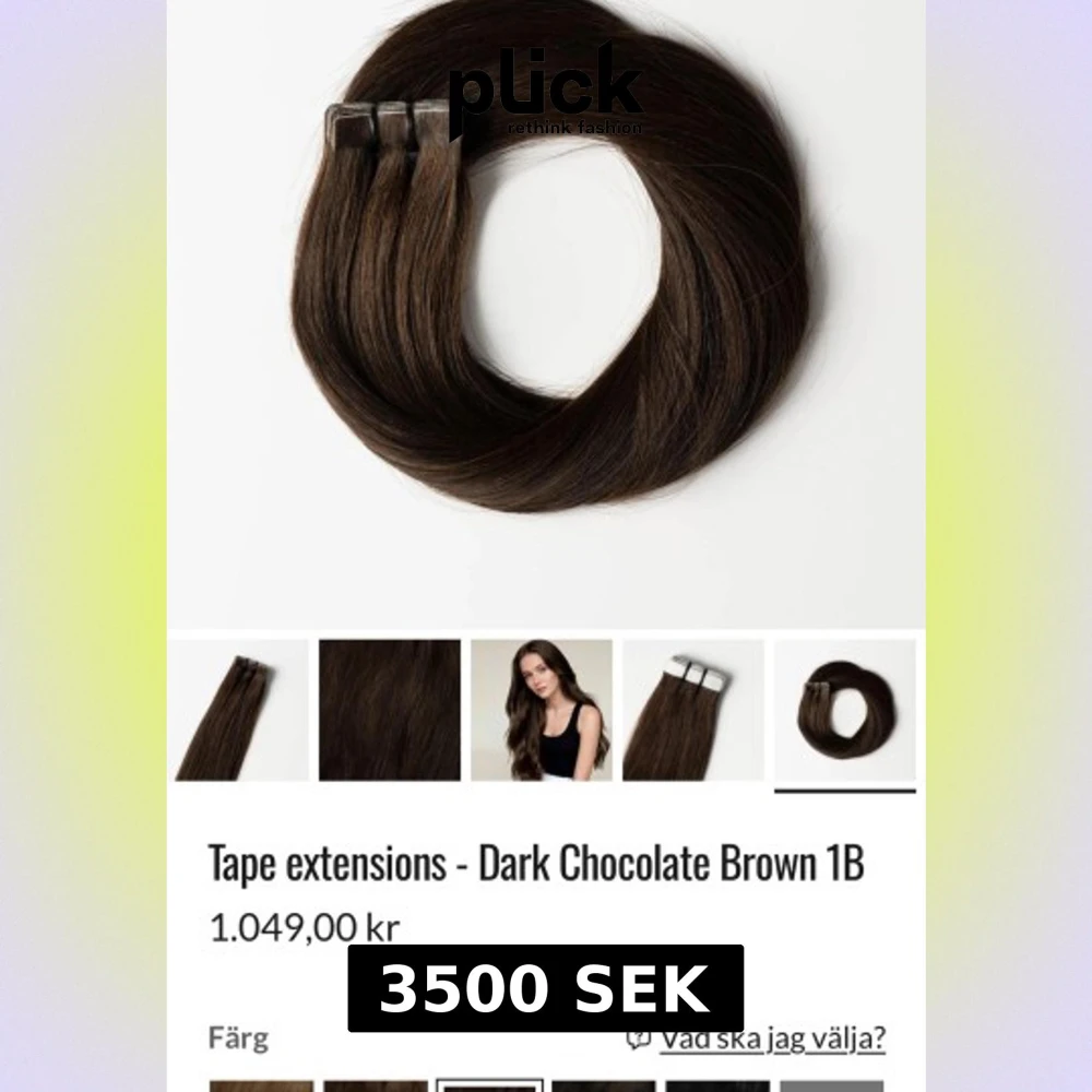 Tape extensions i färgen Dark Chocolate Brown 1B från Myextensions. Snygg, djupbrun nyans med naturlig glans och mjukt. Det är 4 paket och i ett paket är det 50g så totalt är det 200g och 50 centimeter långt. Har haft dom två gånger i mitt hår alltså två omsättningar med tape. Håret är i bra skick. Nypriset är 4 200kr