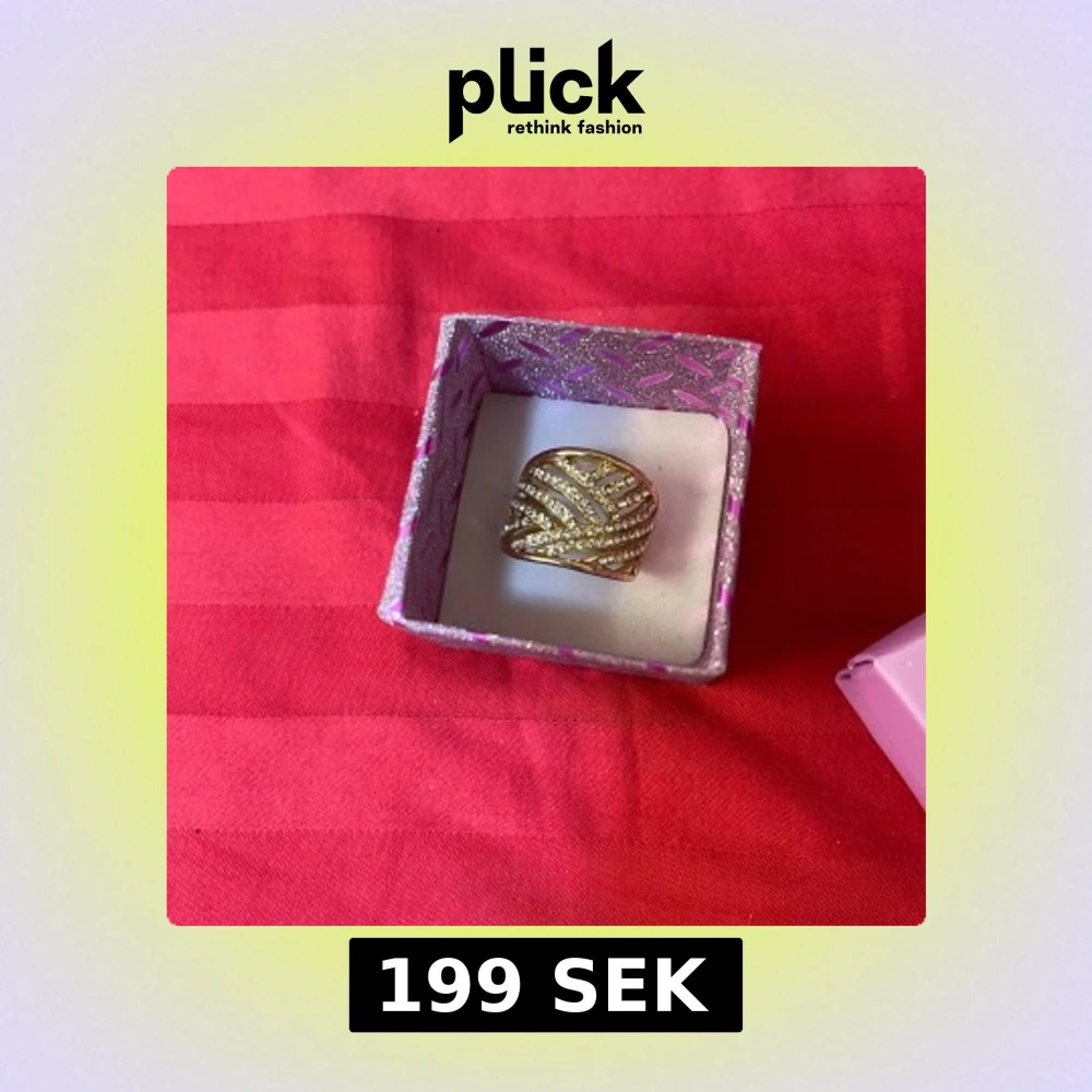 Säljer en bred och statement guldig ring med glittriga stenar i flera rader som bildar ett snyggt mönster. Ringen har en lyxig känsla och kommer i en söt lila presentask med rosett. Perfekt för dig som vill sticka ut med accessoarerna.
