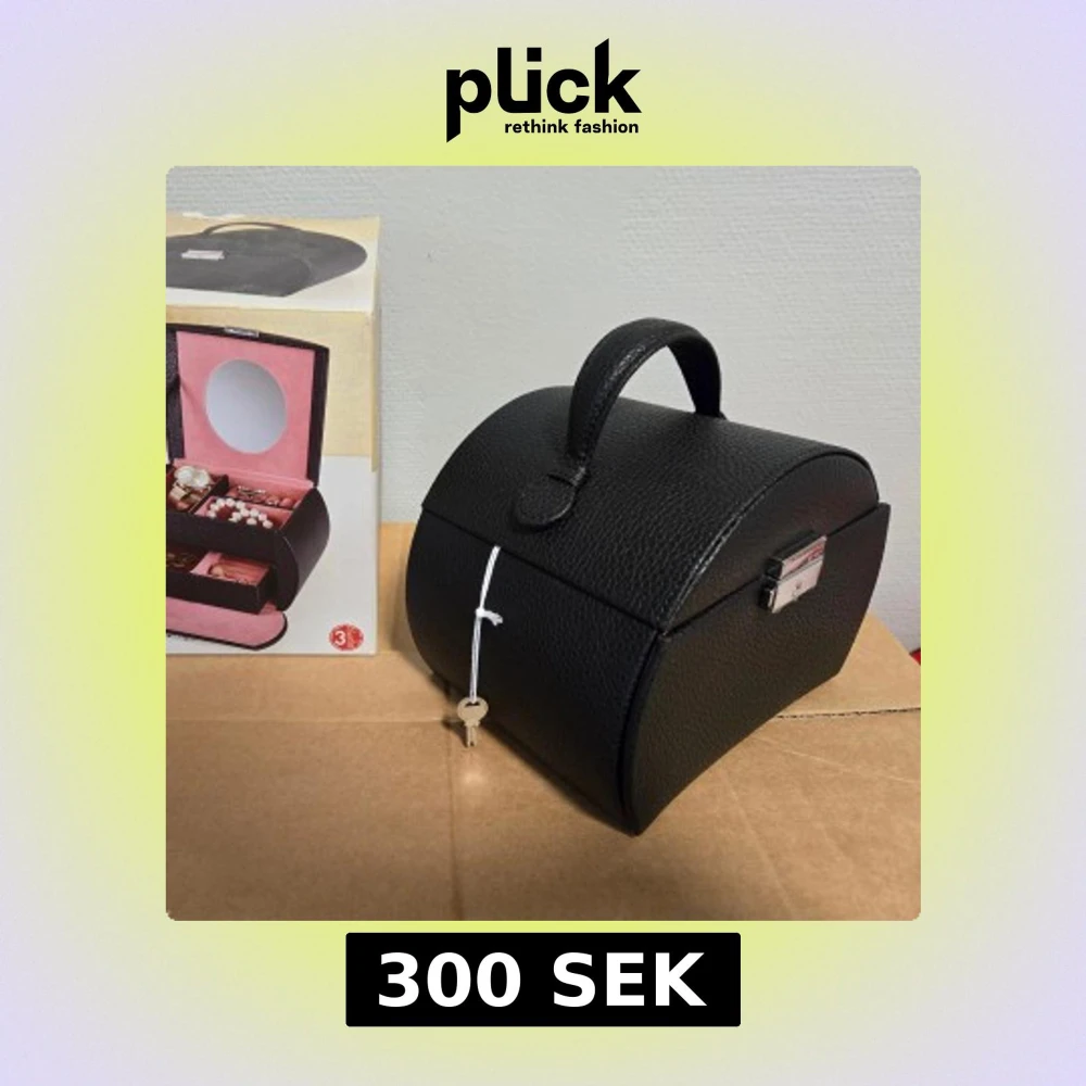 Snygg och praktisk smyckesbox från Esmara i svart konstläder med rosa sammetsinsida. Boxen har flera fack för ringar, armband och örhängen samt en spegel i locket. Låset framtill och medföljande nyckel gör att du kan förvara dina favoritsmycken säkert.