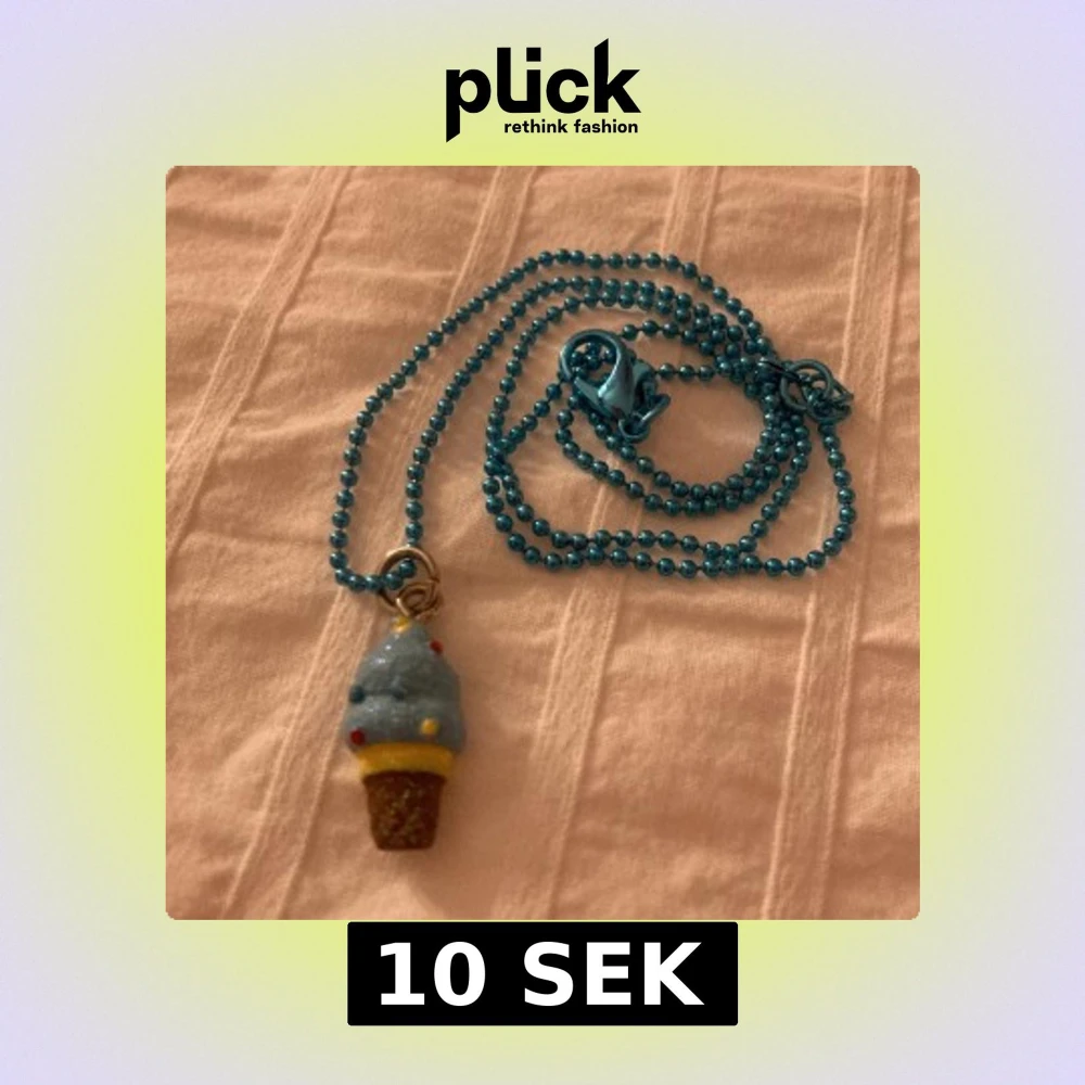 Supergulligt halsband med blå kulkedja och ett hänge som ser ut som en glass i strut. Glassen är ljusblå med färgglatt strössel och struten är brun och gul. Perfekt accessoar för dig som gillar lekfulla smycken. ✨🍬✨