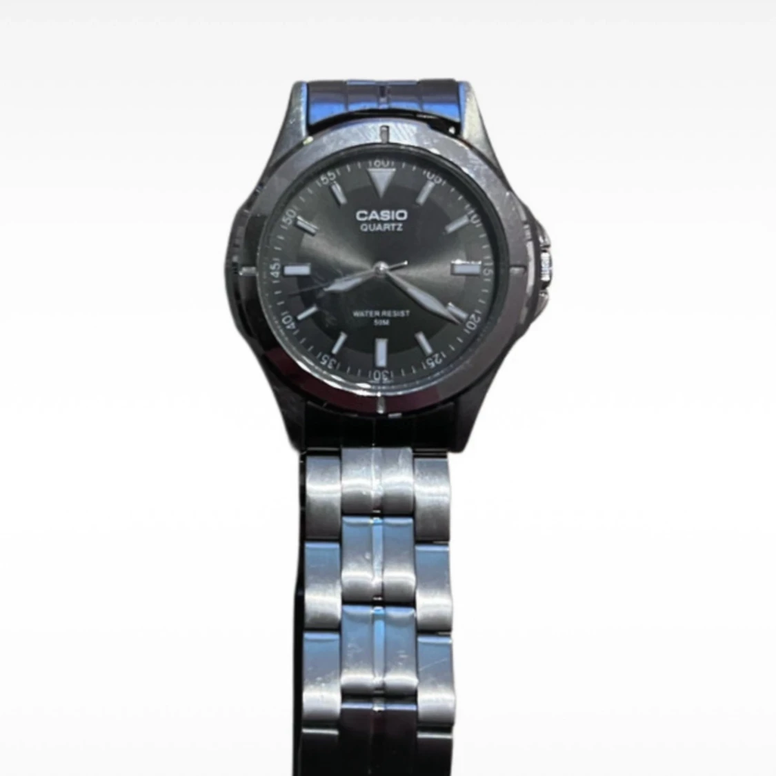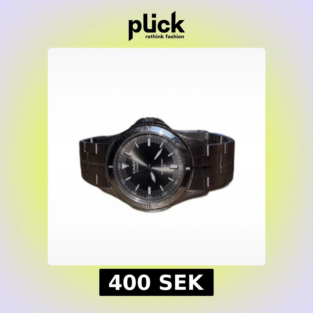 Stilren Casio Quartz klocka med svart urtavla och silvrigt armband i metall. Klockan har tydliga indexmarkeringar, klassisk rund form och vattentålighet upp till 50 meter. Perfekt accessoar för dig som gillar enkel och tidlös design.