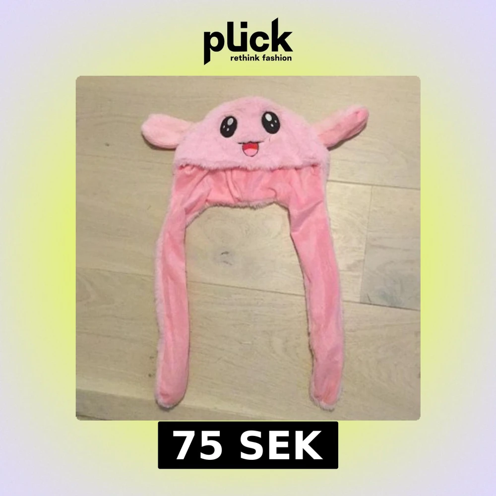 Supergullig rosa kaninmössa i mjuk syntetpäls med långa öron och broderat anime-inspirerat ansikte framtill. På ändarna av öronen finns broderade hjärtan och tassar.