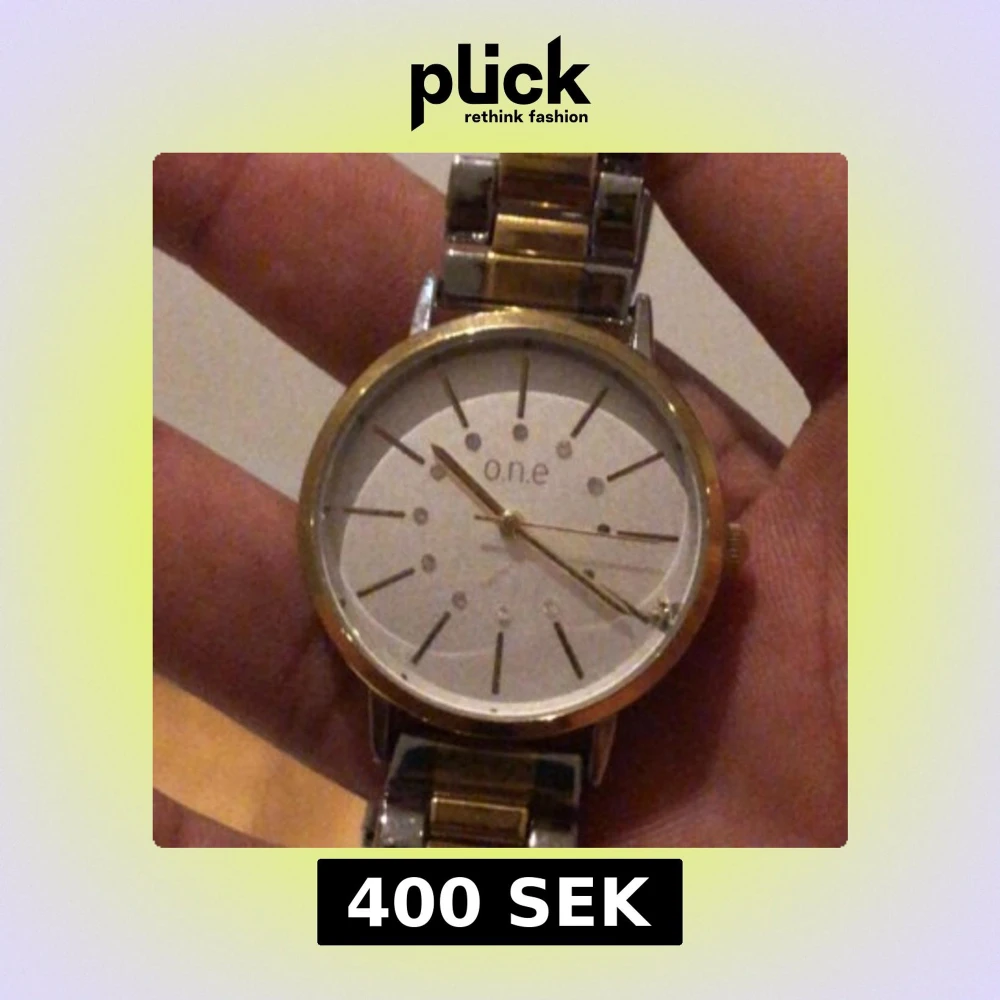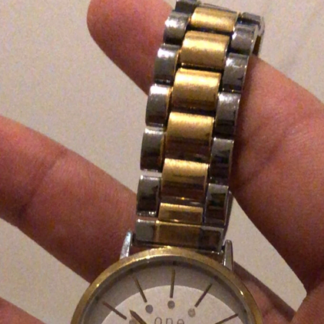 Snygg klocka från o.n.e med rund urtavla i vitt och detaljer i guld. Armbandet är i metall med både guld- och silverfärgade länkar. Urtavlan har minimalistiska markeringar och små stenar som extra detalj. Perfekt för dig som gillar stilrena accessoarer.