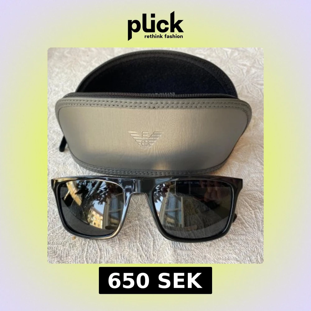 Snygga svarta solglasögon från Emporio Armani med rektangulär form och stilren design. Bågarna är i blank svart plast med diskret logga på sidan. Levereras med originalfodral i grått med logotyp. Köpta för 1170kr