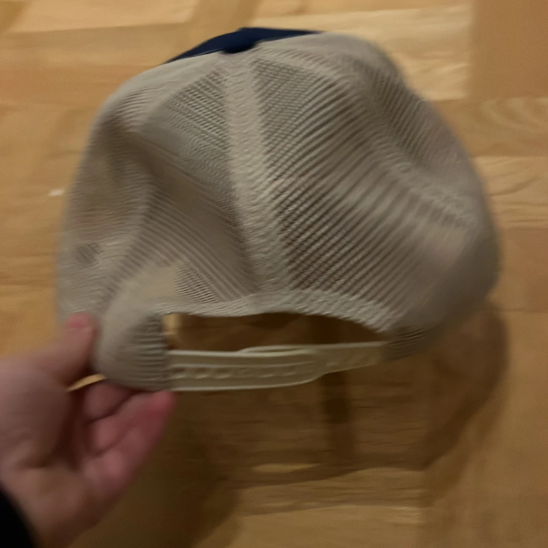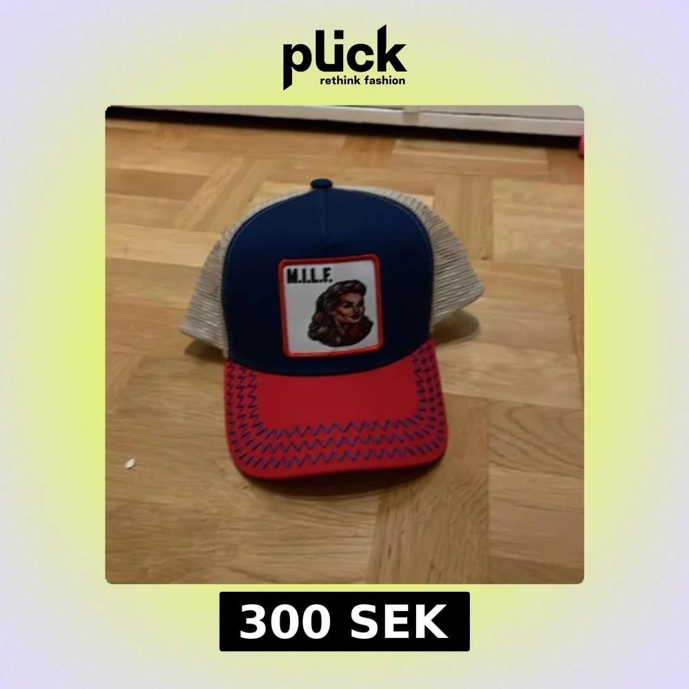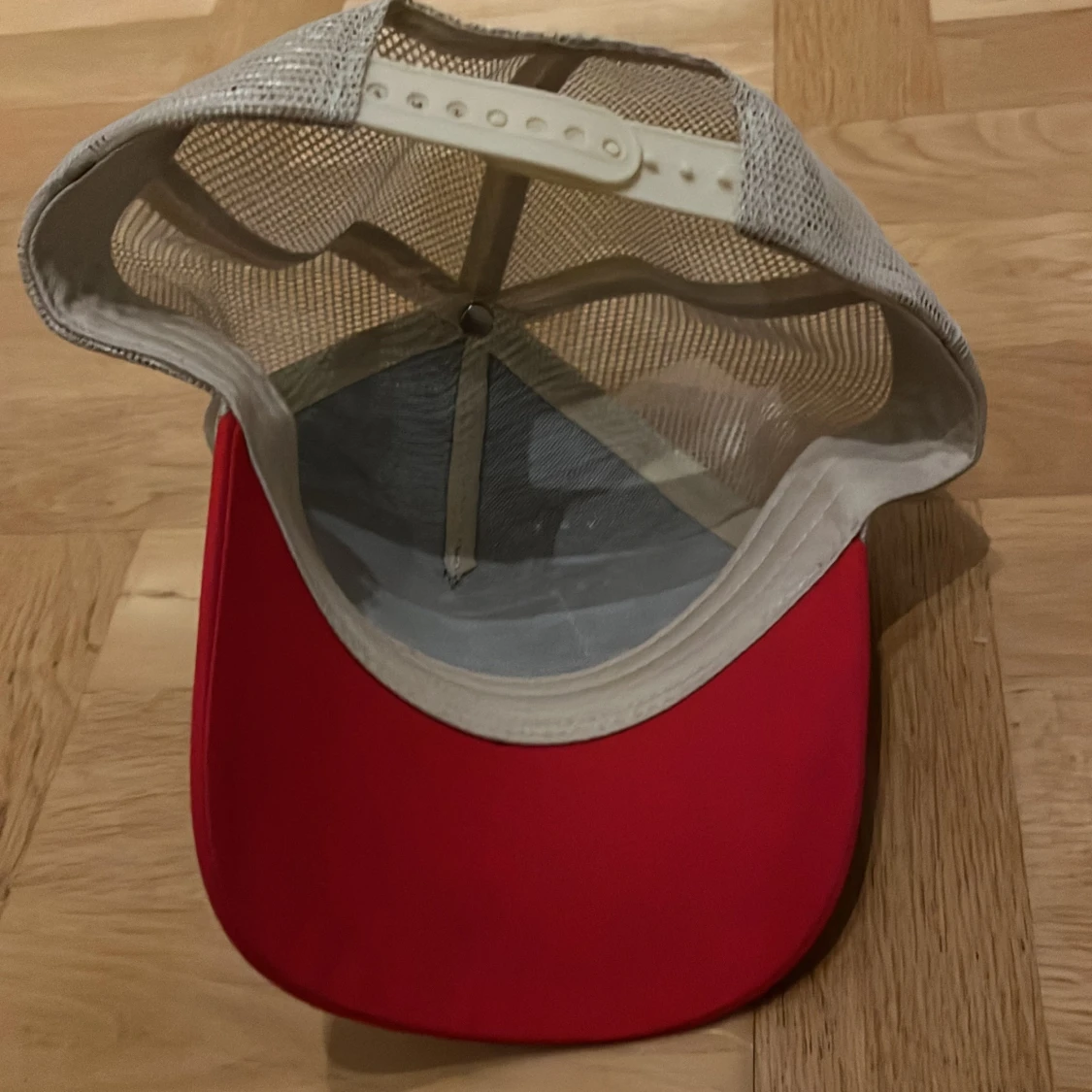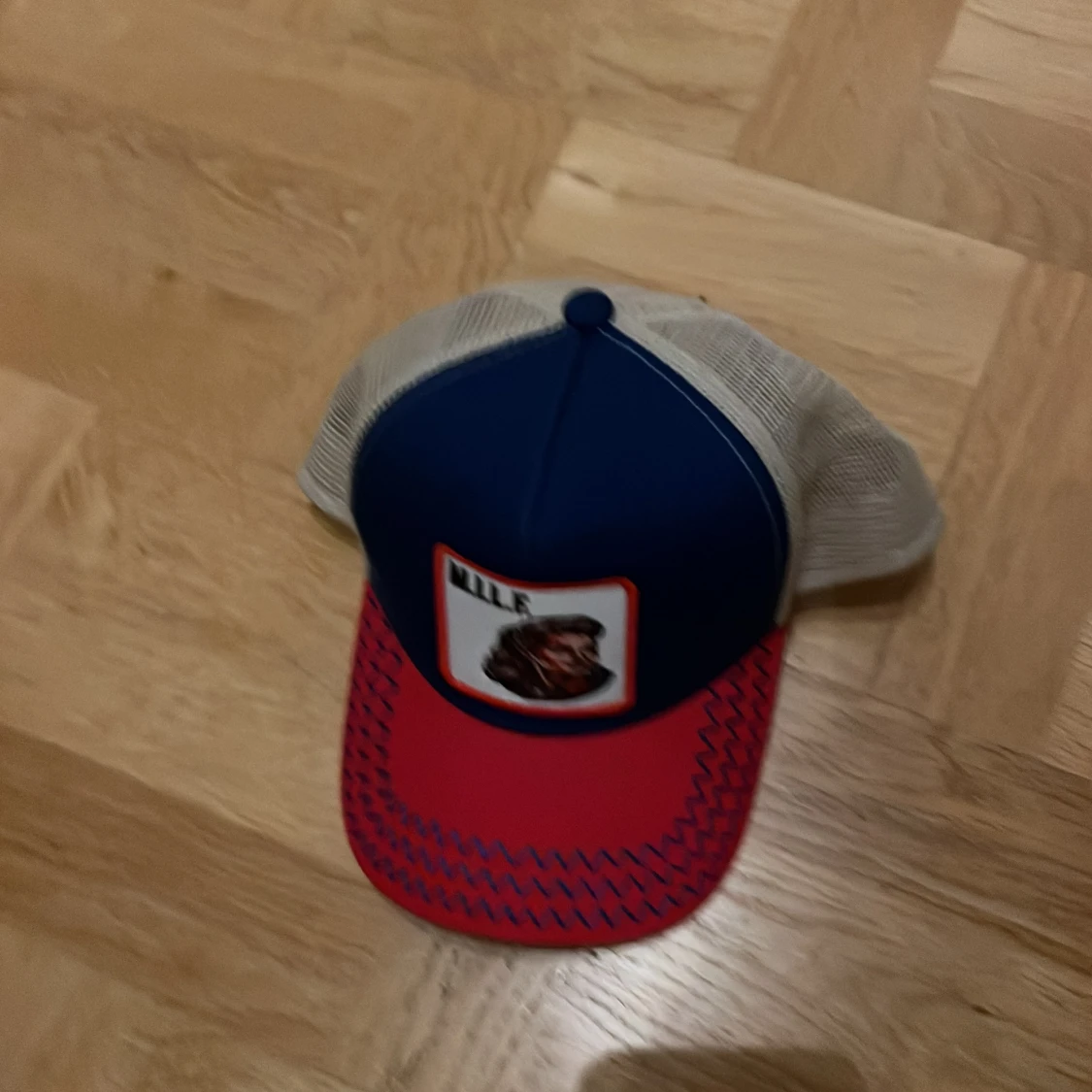 Snygg keps med blå framsida och röd skärm. Baktill finns ett beige nät för ventilation. Framsidan pryds av en broderad patch med text och bild. Perfekt för en avslappnad stil.