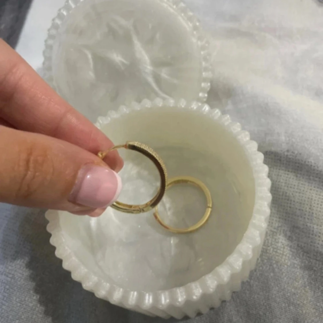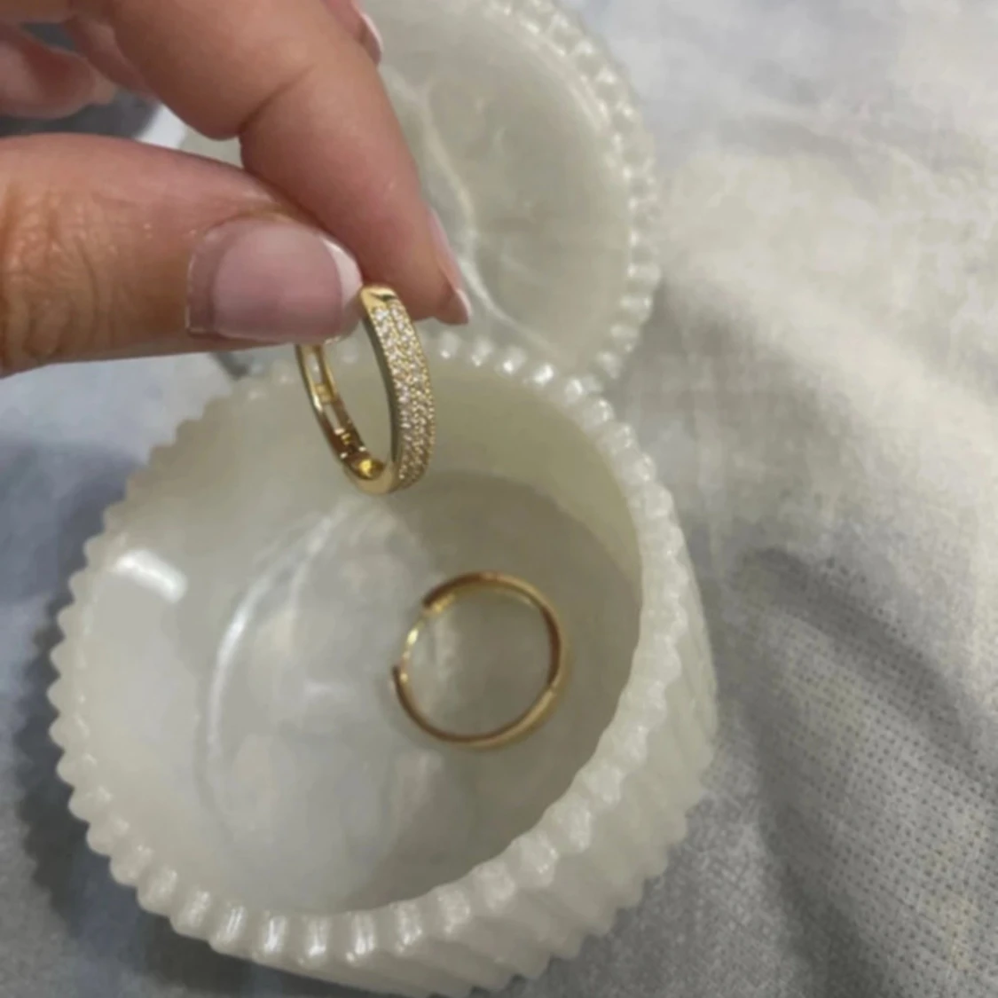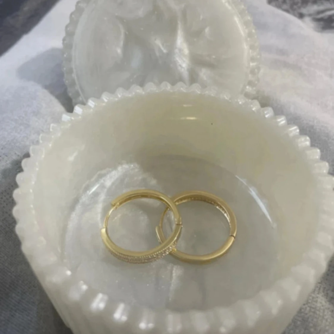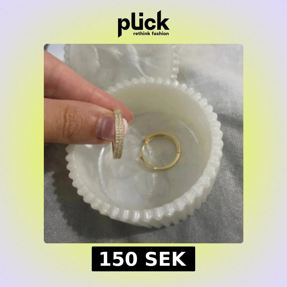Säljer ett par snygga guldiga creoler med glittriga små stenar längs hela framsidan köpta i Turkiet . De är runda och har en klassisk, stilren design som ändå sticker ut tack vare stenarna. Perfekta för dig som gillar lite extra bling i vardagen.