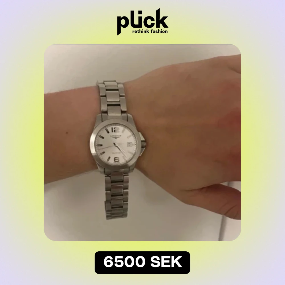 Säljer en stilren och elegant silverfärgad klocka från Longines. Klockan har en klassisk design med en vit urtavla och tydliga siffror vid 12 och 6. Den har också ett datumfönster vid 3. Armbandet är i rostfritt stål och ger en lyxig känsla. Perfekt för både vardag och fest!