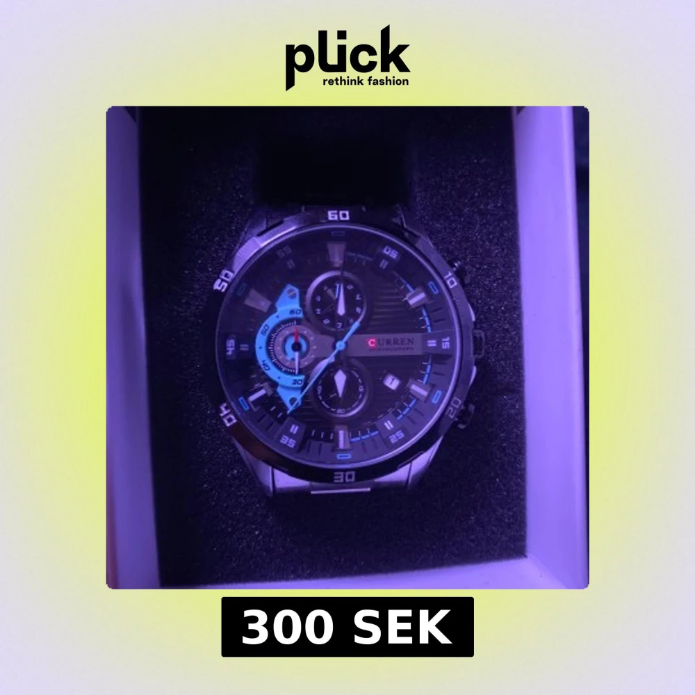 Snygg och modern klocka från Curren med en robust design. Urtavlan har detaljer i blått och svart med flera sub-dials. Armbandet är i rostfritt stål och klockan är vattentålig. Perfekt för den som vill ha en stilren accessoar. Batteriet är dött så köparen får byta