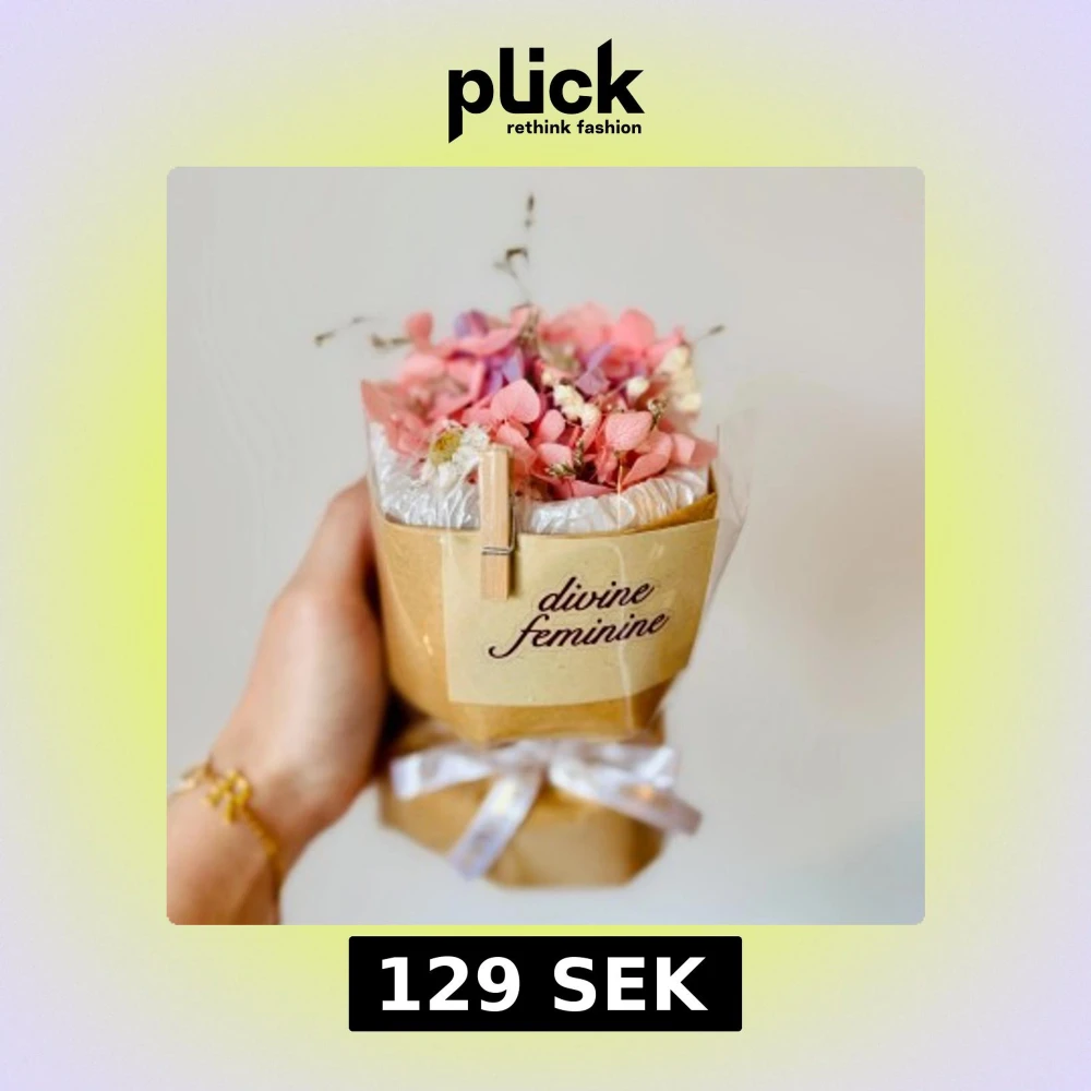 en bukett med torkade blommor i rosa och lila toner, inslagna i brunt papper och dekorerad med en vit rosett. På pappret sitter en etikett med texten 'divine feminine'.