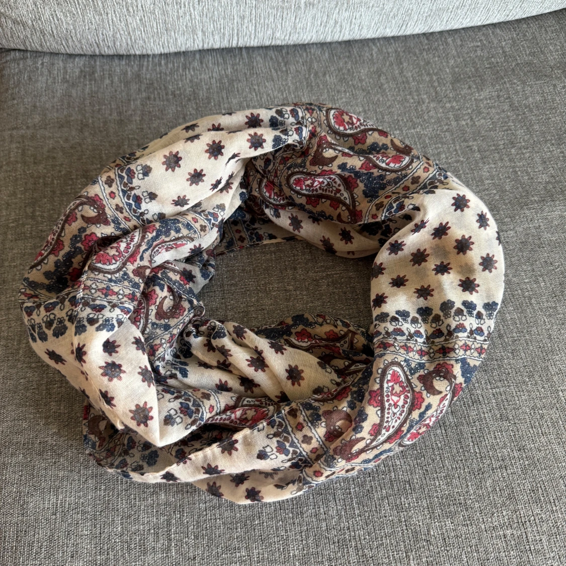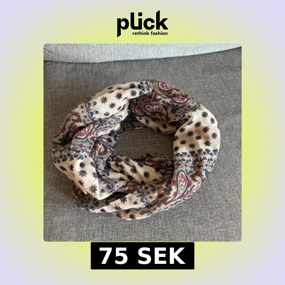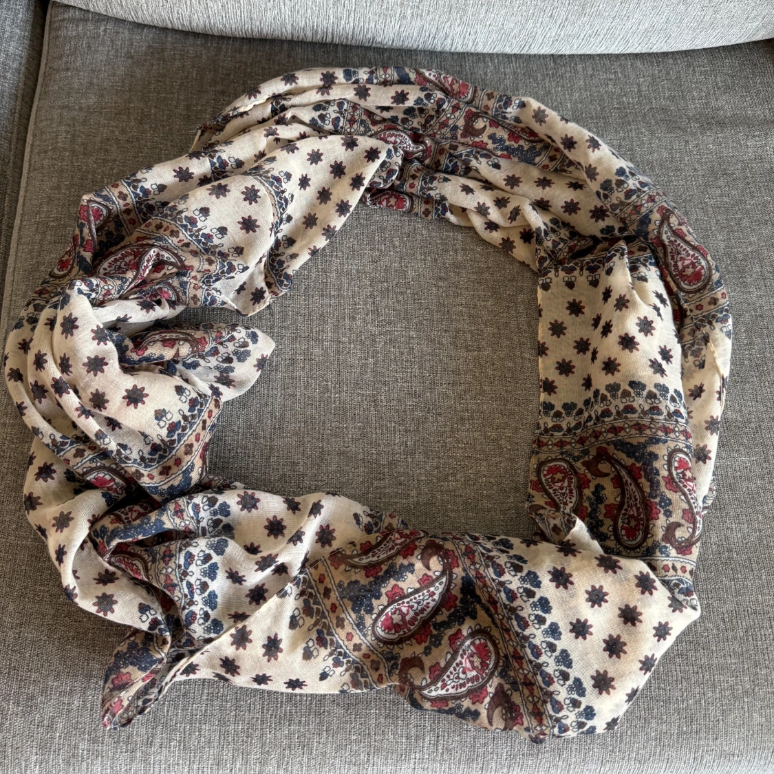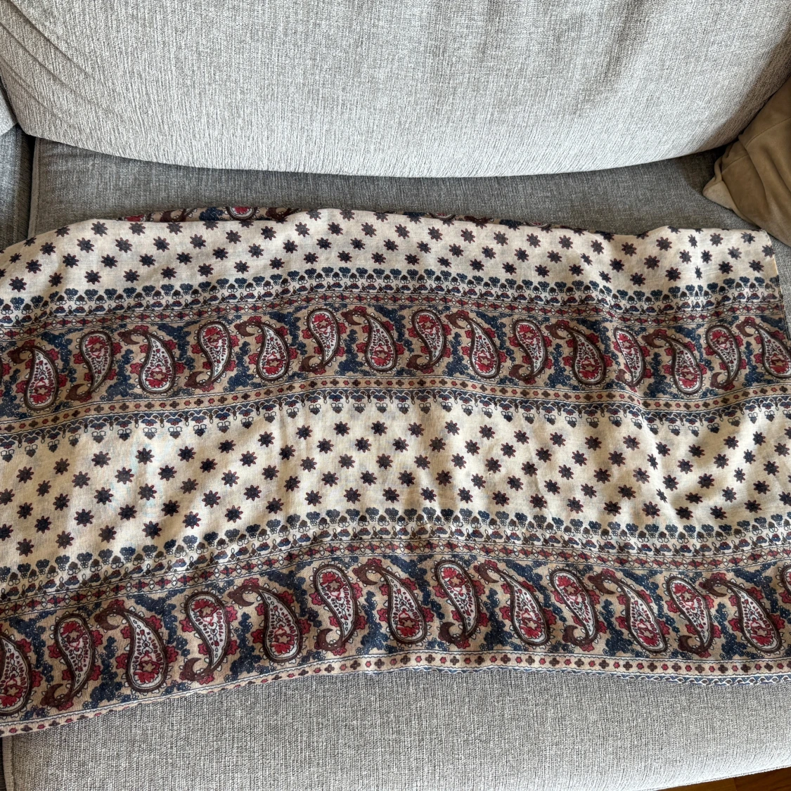 •Sjal med ett vackert mönster i olika färger. •Den har ett paisley-liknande tryck kombinerat med små stjärnor, vilket ger den ett unikt utseende. •Använd 1-2 gånger, som ny. •80 % viskos, 20 % bomull •Djurfritt och rökfritt hem.