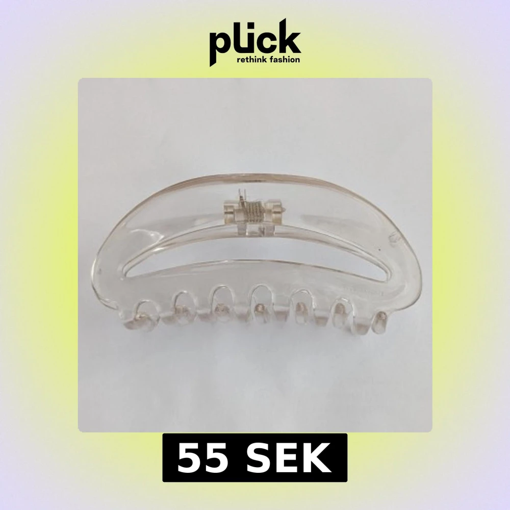 Säljer en stilren och transparent hårklämma i plast. Perfekt för att enkelt sätta upp håret med stil. Klämman har en klassisk design med en stark fjäder för bra grepp.