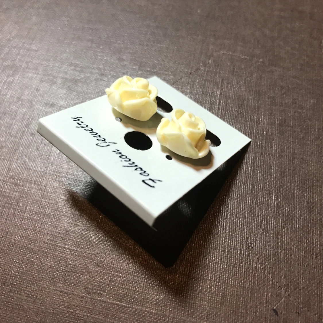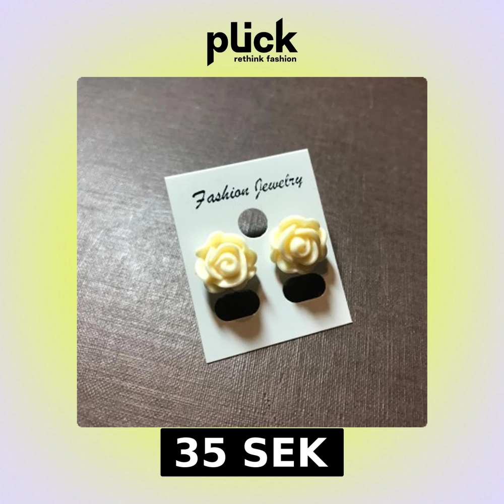 Säljer ett par söta krämfärgade örhängen formade som rosor. Perfekta för att ge en romantisk touch till din outfit. De är små och eleganta, vilket gör dem lätta att bära till olika tillfällen.