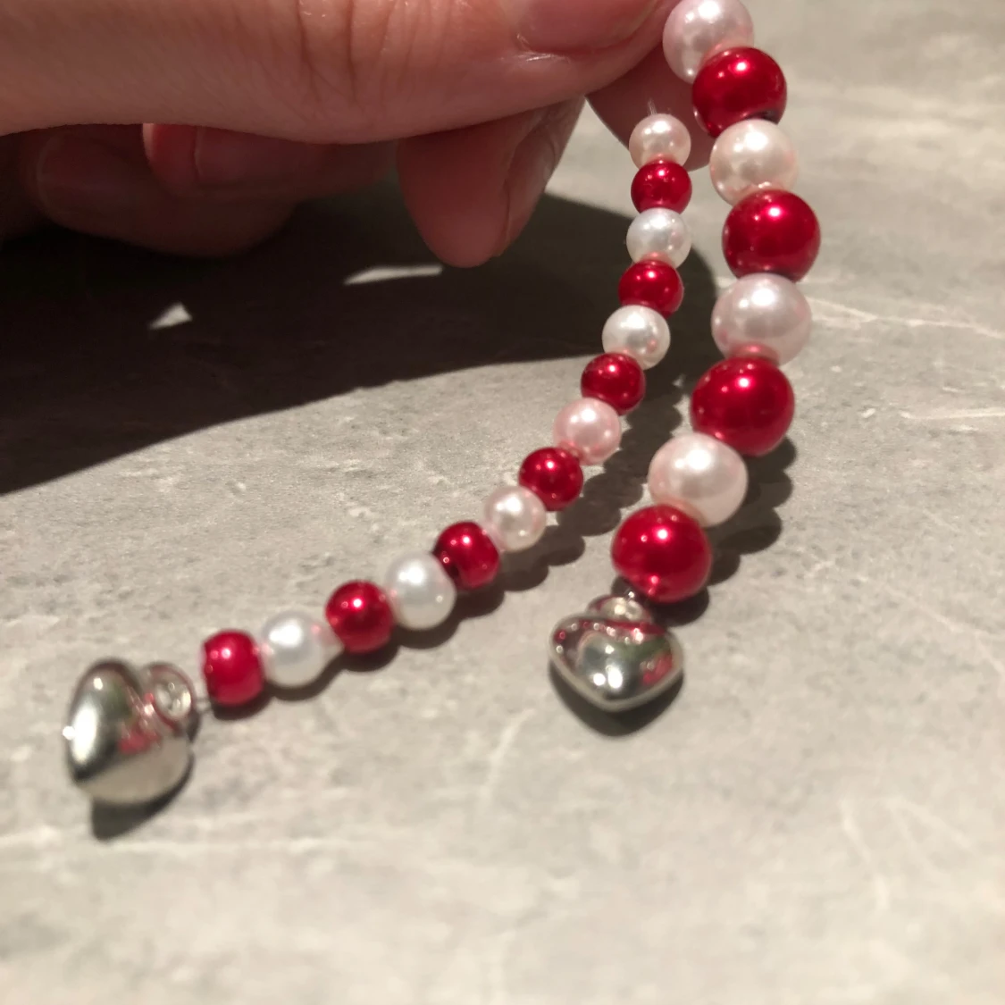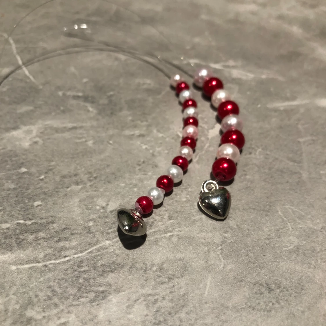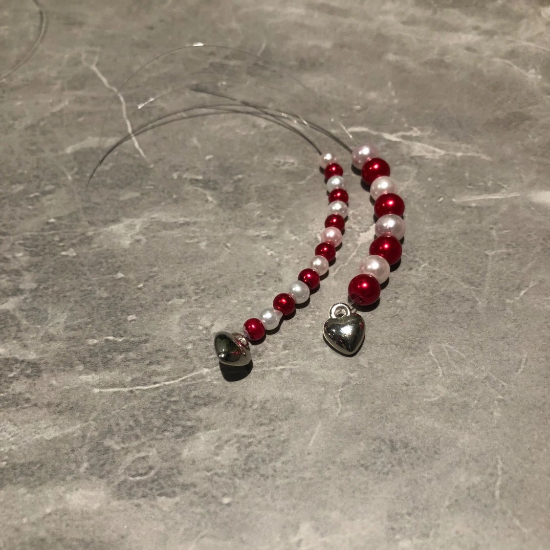 Charmiga hängare på tex nyckeln med röda och vita pärlor i olika storlekar. Varje örhänge avslutas med en silverfärgad hjärtberlock. Perfekt för att ge en färgglad touch till din outfit. 60 kr för båda 30 för ett