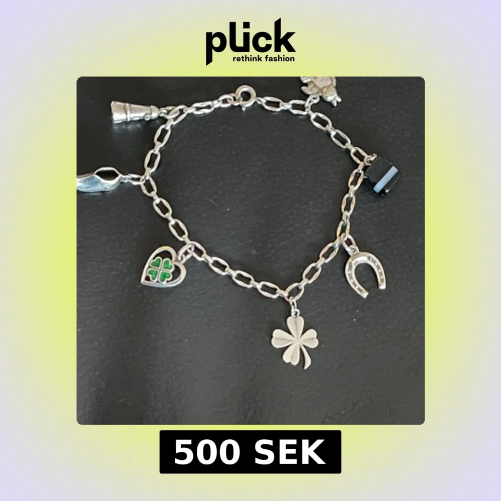 Charmigt silverarmband med flera lyckobringande berlocker, inklusive en fyrklöver, hästsko och hjärta med grön detalj. Perfekt för att ge en personlig touch till din stil.