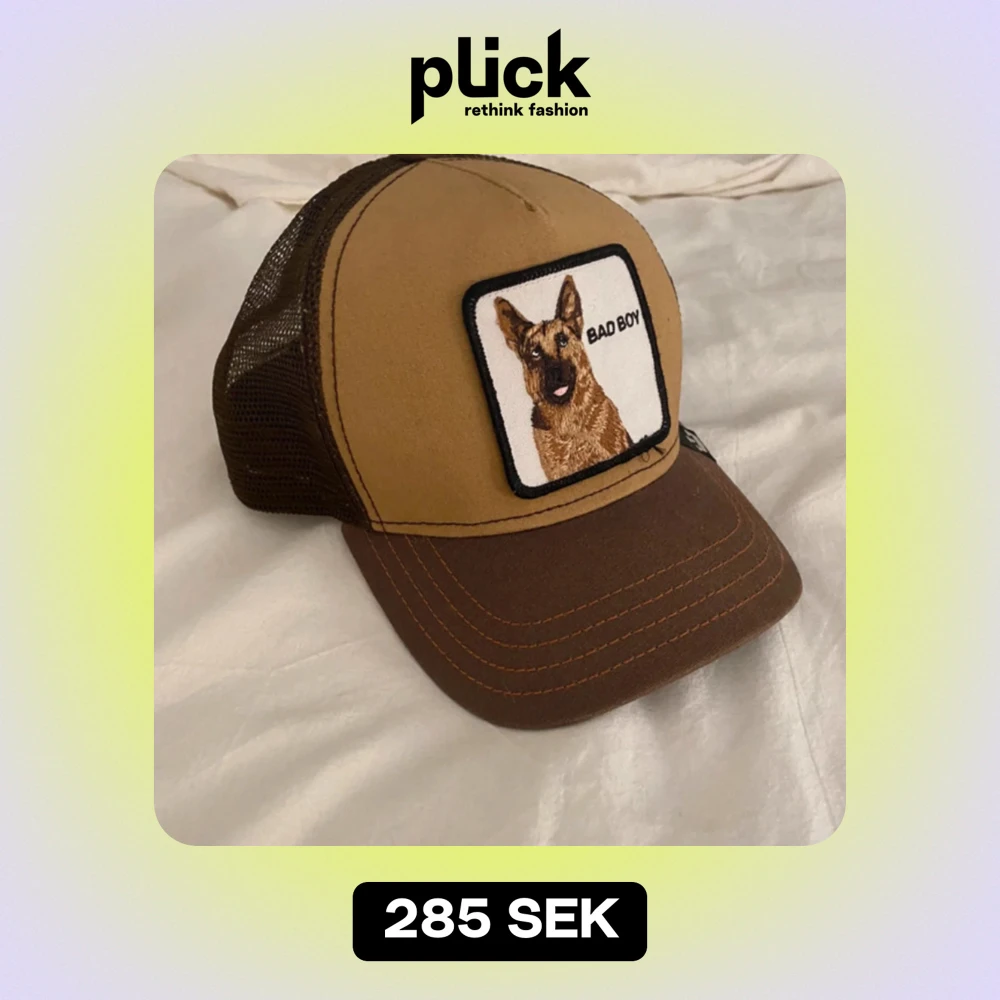 Säljer en cool brun keps med ett broderat hundmotiv och texten 'Bad Boy'. Kepsen har ett nät på baksidan för bra ventilation och en justerbar rem för perfekt passform. Perfekt för en avslappnad stil eller en dag ute i solen!