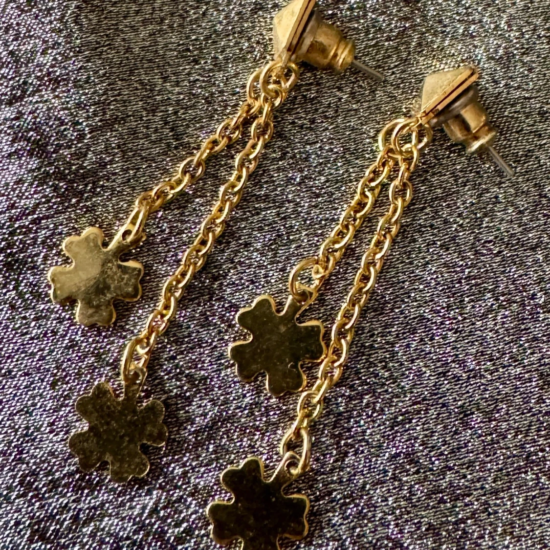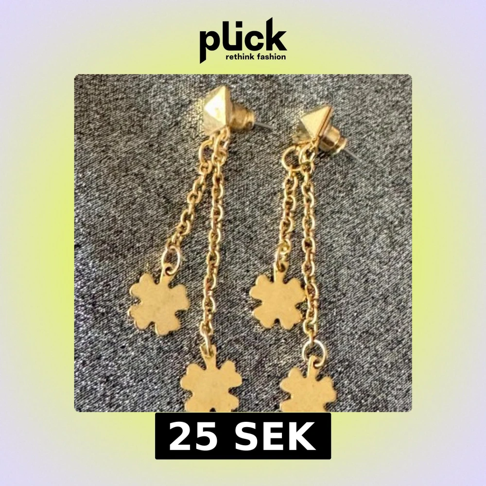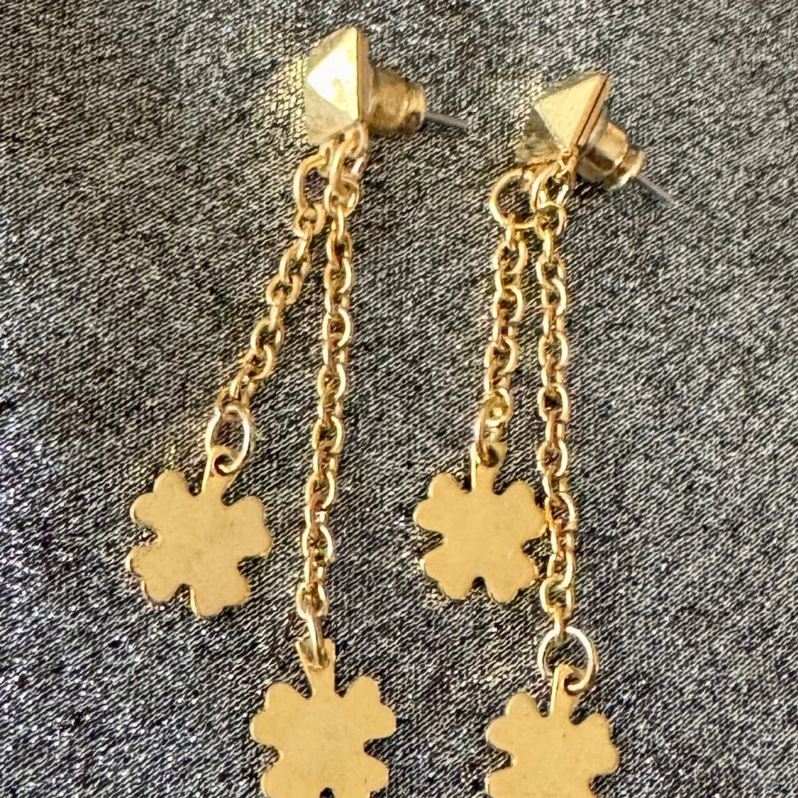 Snygga guldiga örhängen med två kedjor på varje sida och små fyrklöver som hänger längst ner. Örhängena har coola geometriska pluppar och är ca4 cm långa.