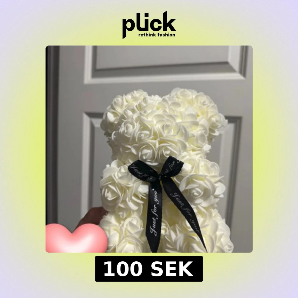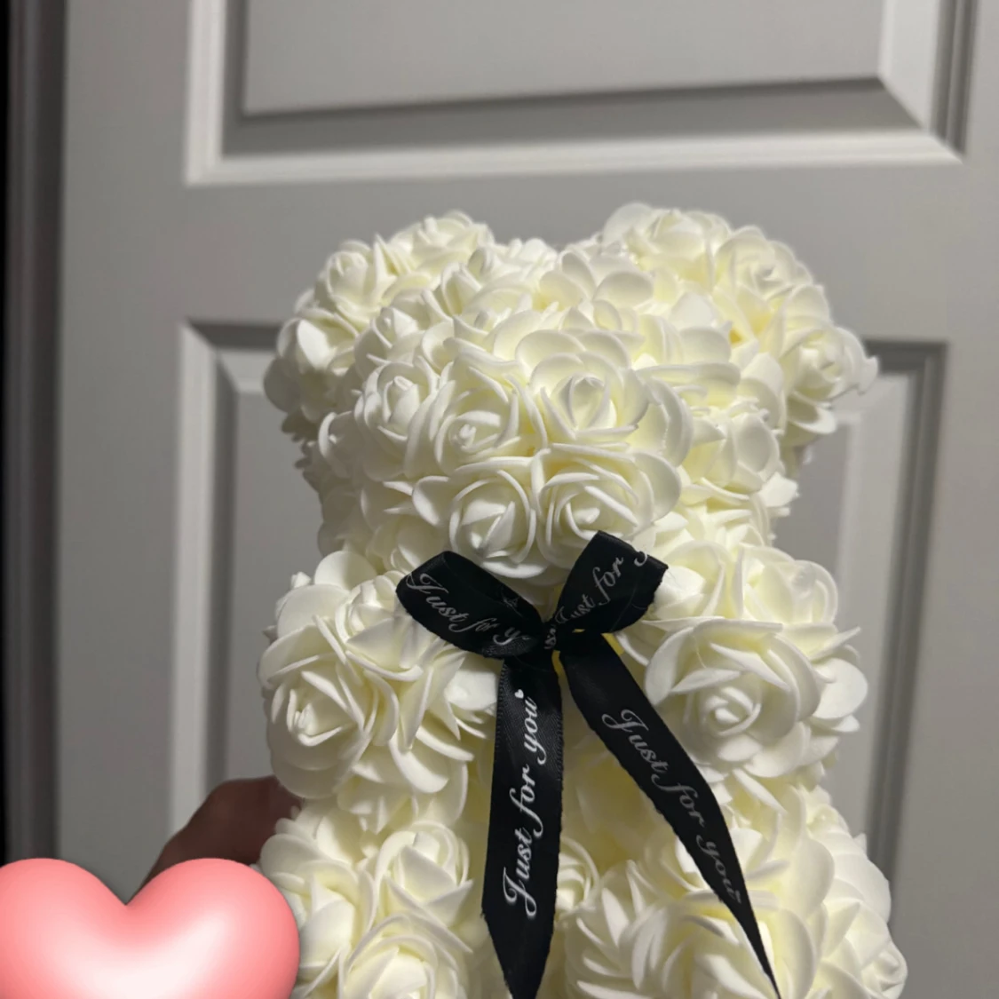 Supergullig björnformad dekoration gjord av vita konstrosor, prydd med en svart rosett där det står 'Just for you'. Perfekt som present eller inredningsdetalj till rummet.